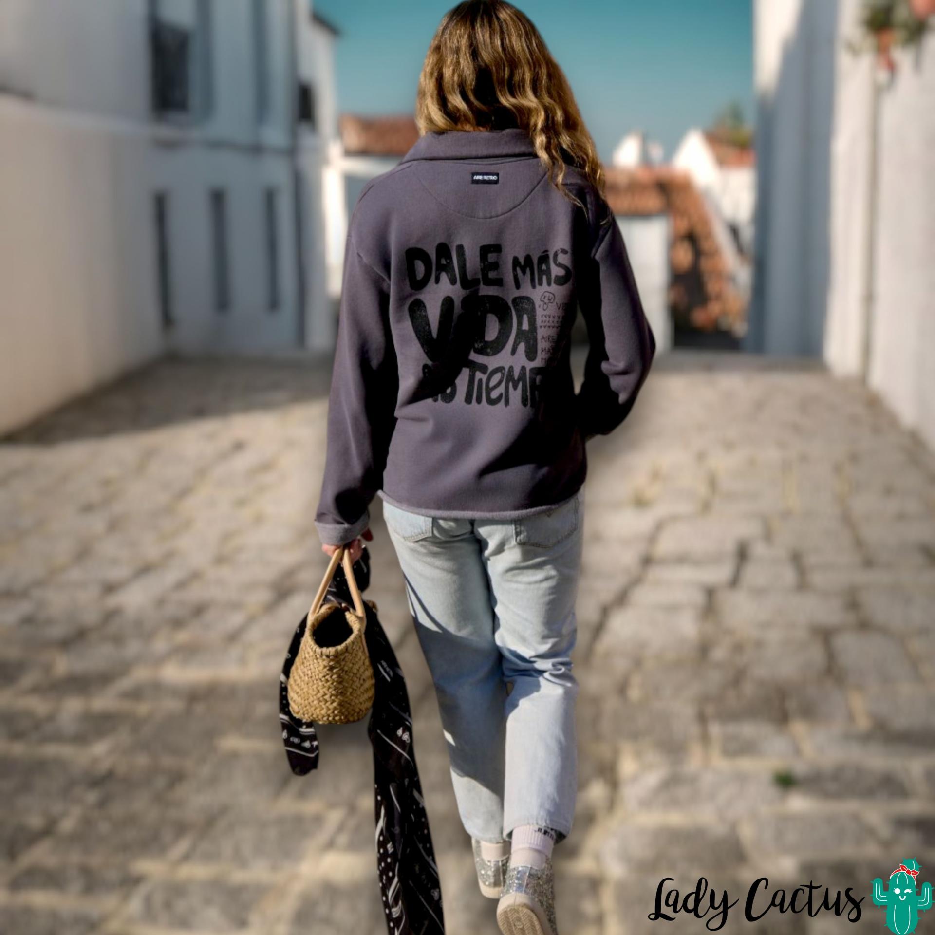 Entre las novedades Aire Retro que inspiran a vivir intensamente, la sudadera Mas Vida gris se posiciona como un recordatorio cálido y reflexivo, fusionando comodidad con un mensaje que resuena en el alma. Confeccionada en 100% algodón con felpa gustosa y suavecita en el interior, su diseño tipo polo con cuellos añade un toque clásico versátil, mientras las ilustraciones delantera y trasera —"Dale más vida a tu tiempo"— infunden una profundidad emocional que captura la esencia auténtica de la marca. Diseñada en España con creatividad apasionada y fabricada artesanalmente en Portugal, esta sudadera Aire Retro de grosor medio ofrece calidez acogedora, promoviendo una moda sostenible que resiste lavados suaves y mantiene su textura intacta. Aunque no hay modelo específica, imagina su ajuste perfecto en siluetas urbanas, elevando lo cotidiano con su narrativa personal. Combínala con pantalones jogger neutros para un look introspectivo y relajado, o con vaqueros oscuros para un contraste dinámico y femenino que resalte su espíritu vital. Ideal para mentes soñadoras que valoran ropa con mensaje, esta sudadera gris no solo abriga el cuerpo, sino que despierta conexiones profundas, atrayendo conversaciones en un mundo acelerado. Como parte del nuevo Aire Retro, representa esa innovación fresca que transforma la moda en una celebración de la vida, con una ilustración muy "yo" que arde de pasión sin agotarse.