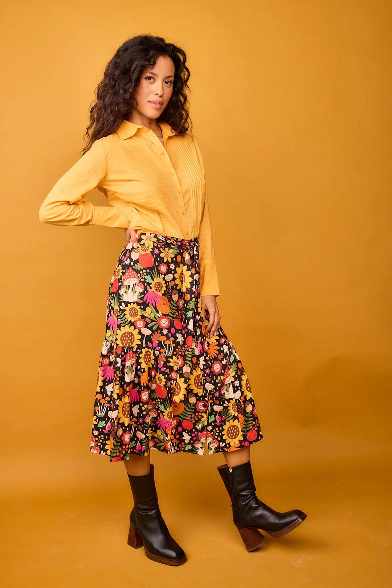Falda de botones y por debajo de la rodilla, tiene un volantito en la parte de abajo. Va toda forrada con forro de algodón. Es completamente maravillosa!