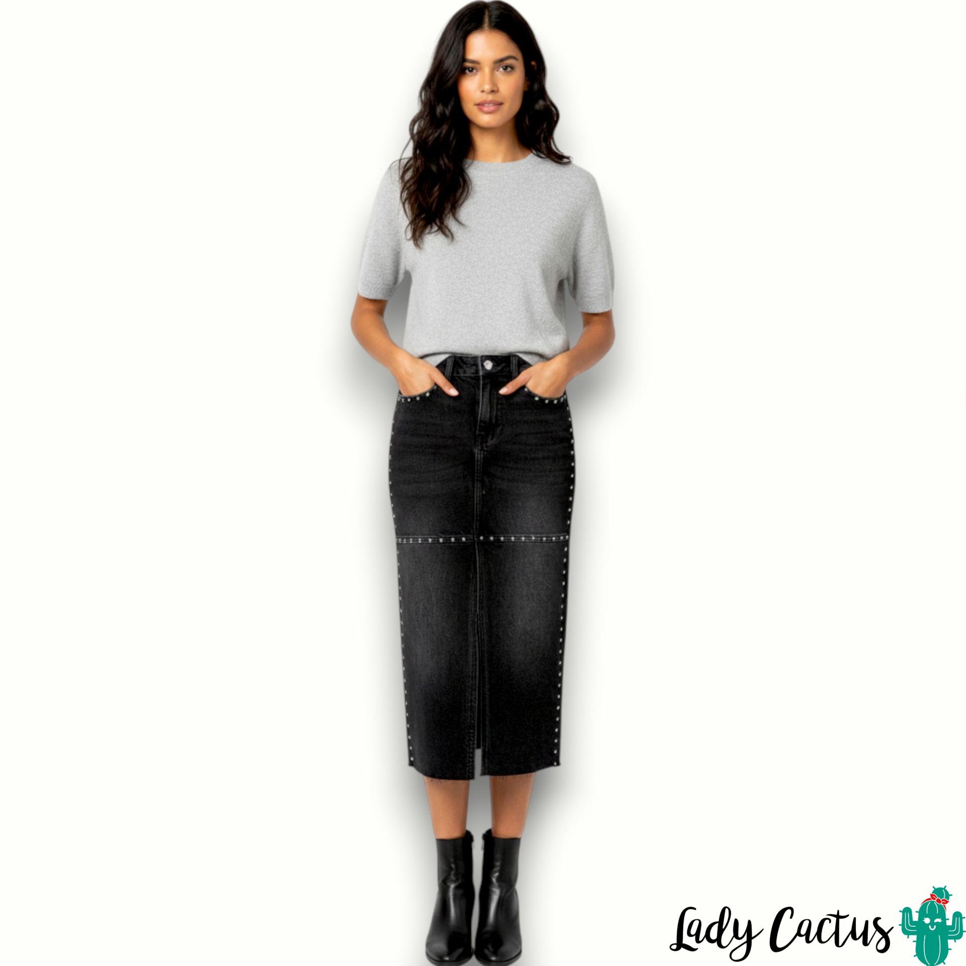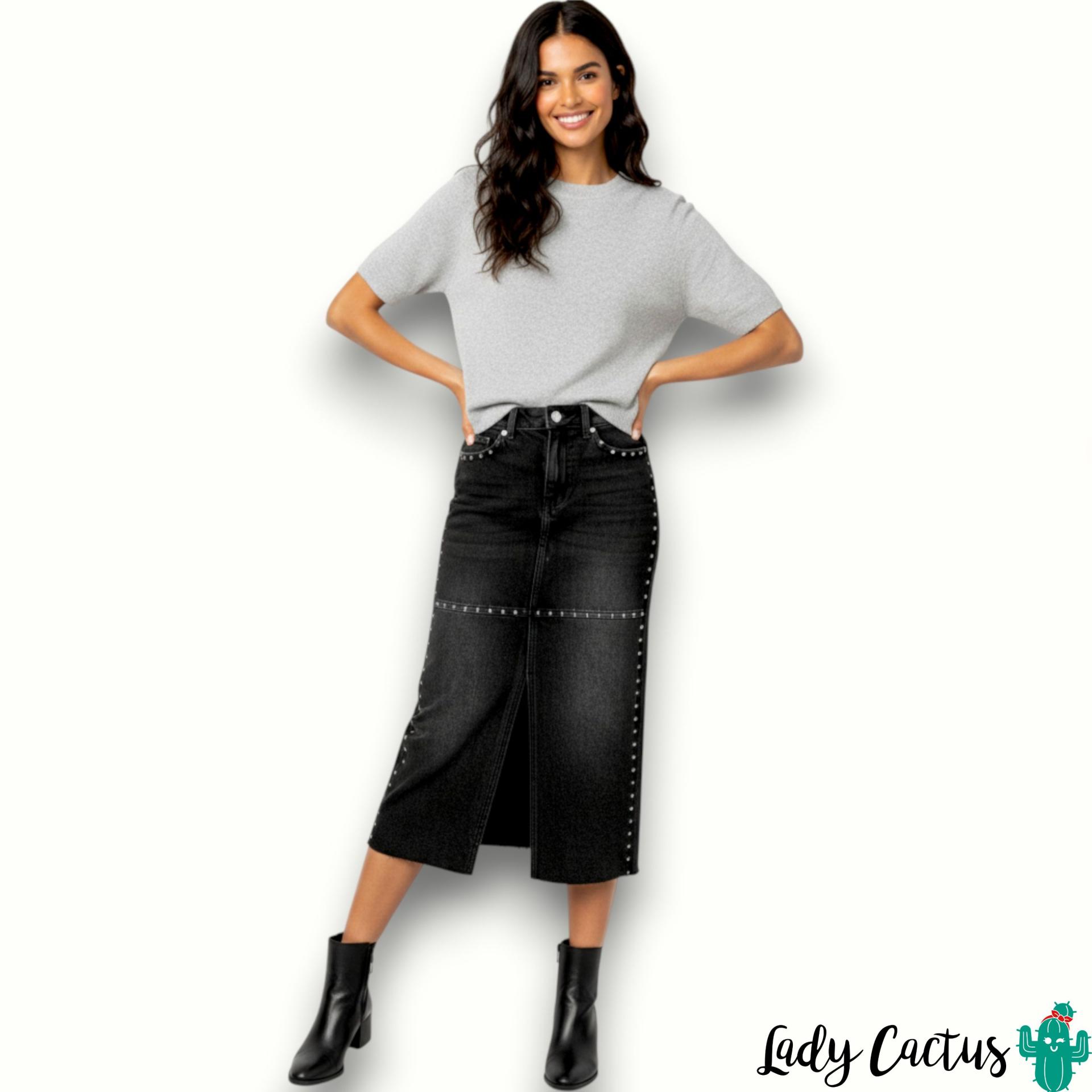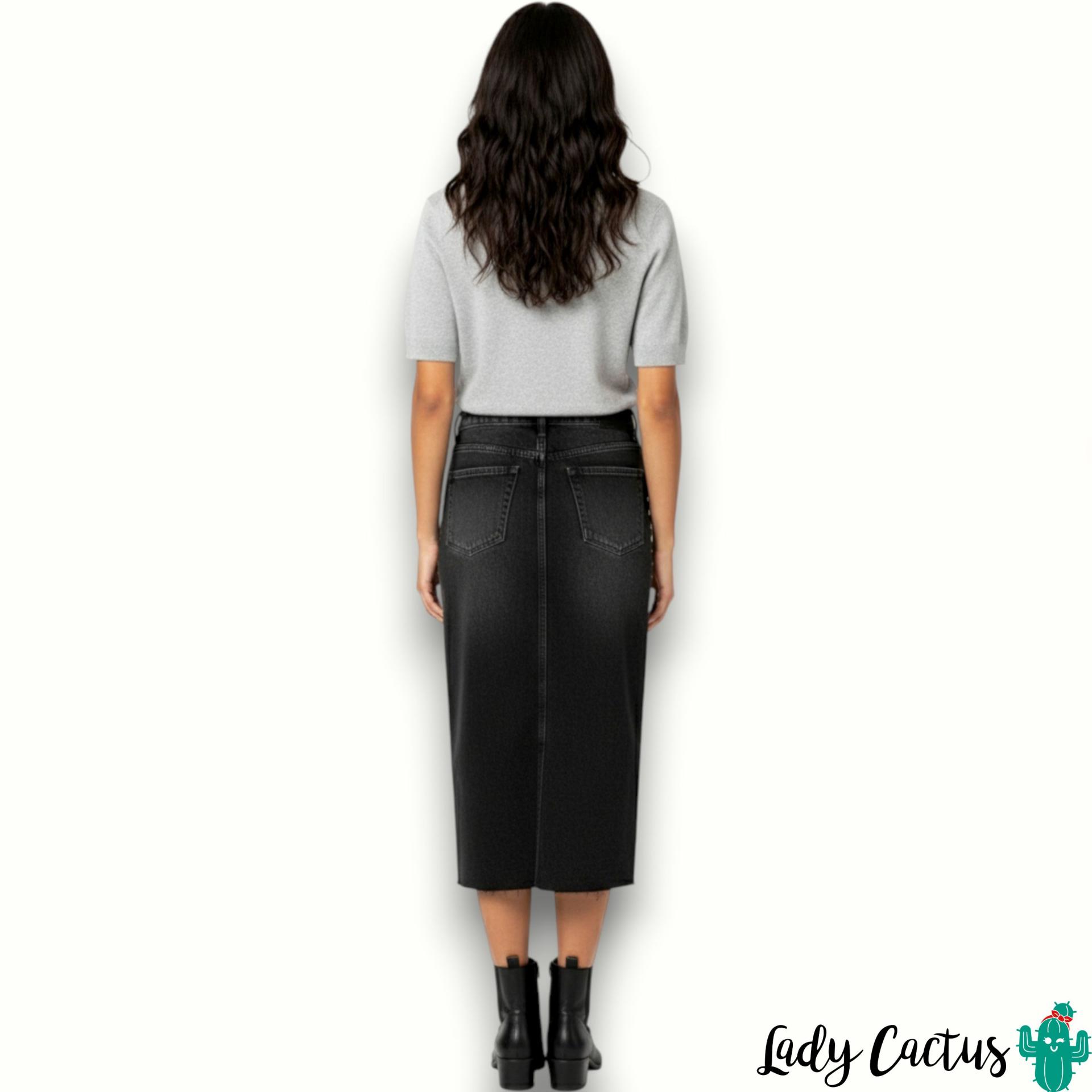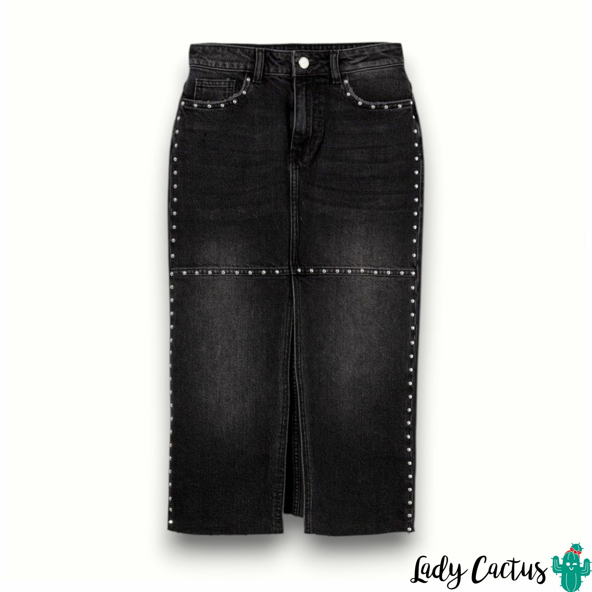 Falda Paola de Tiffosi: lápiz denim negra con tachuelas y abertura frontal, 99% algodón elástico para un estilo urbano versátil.