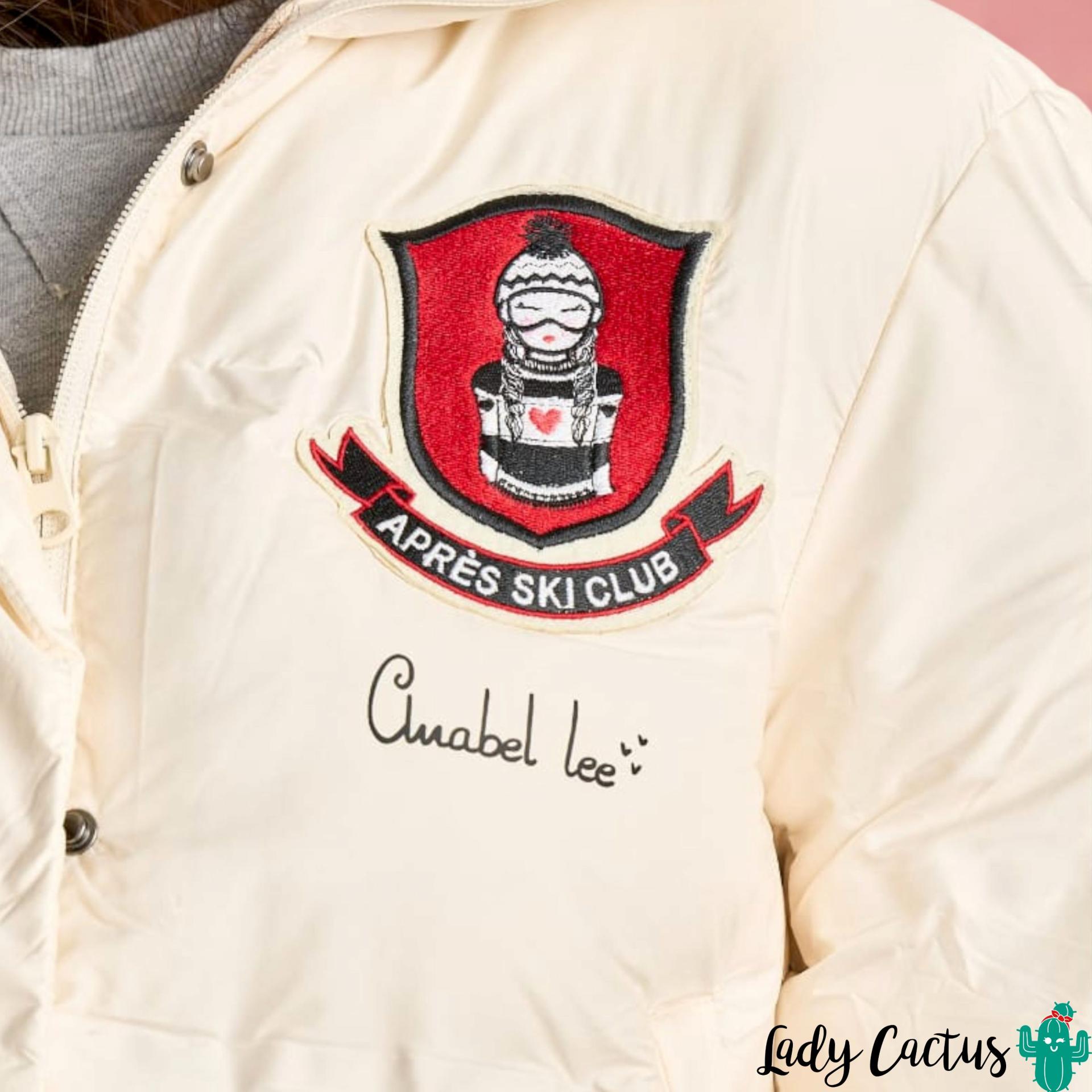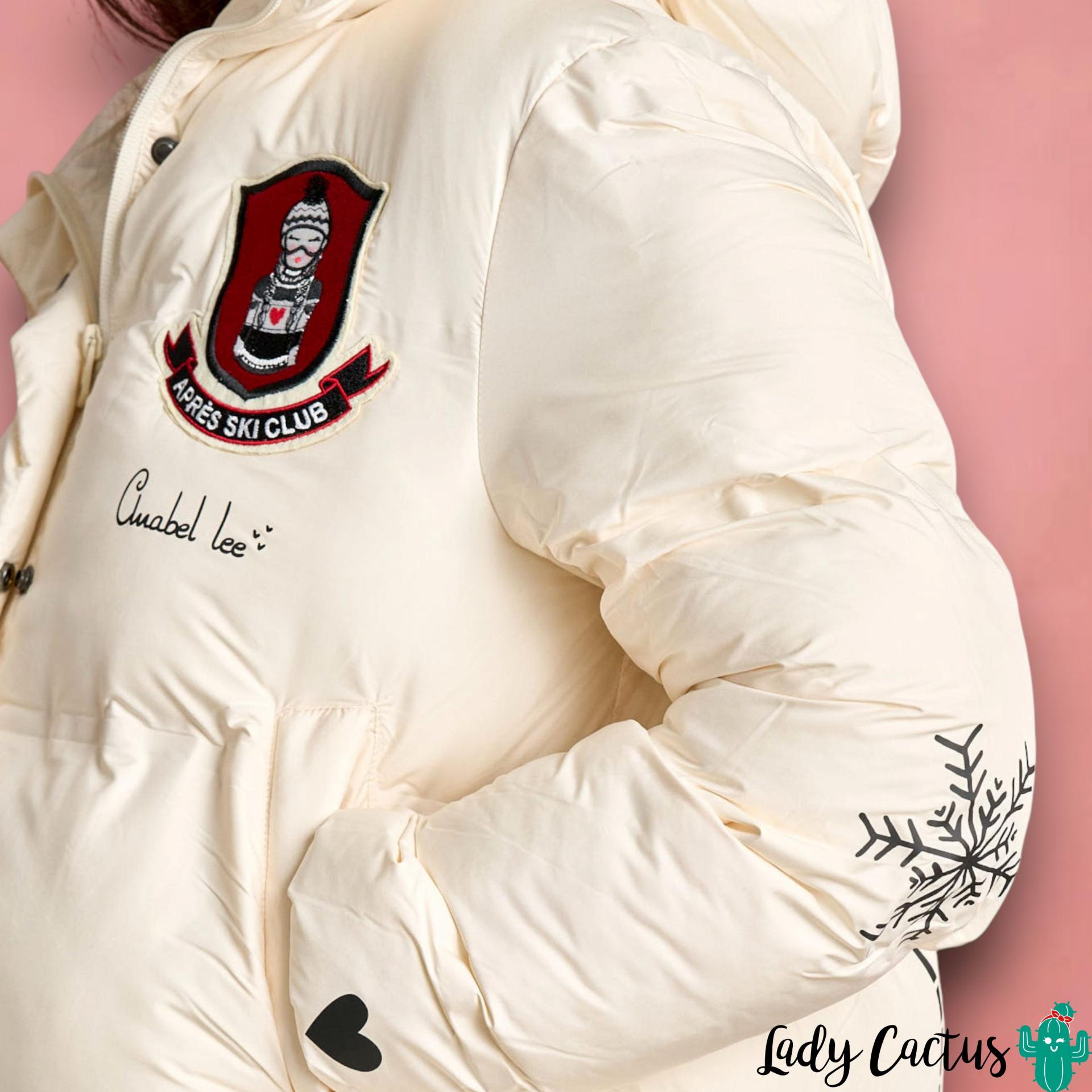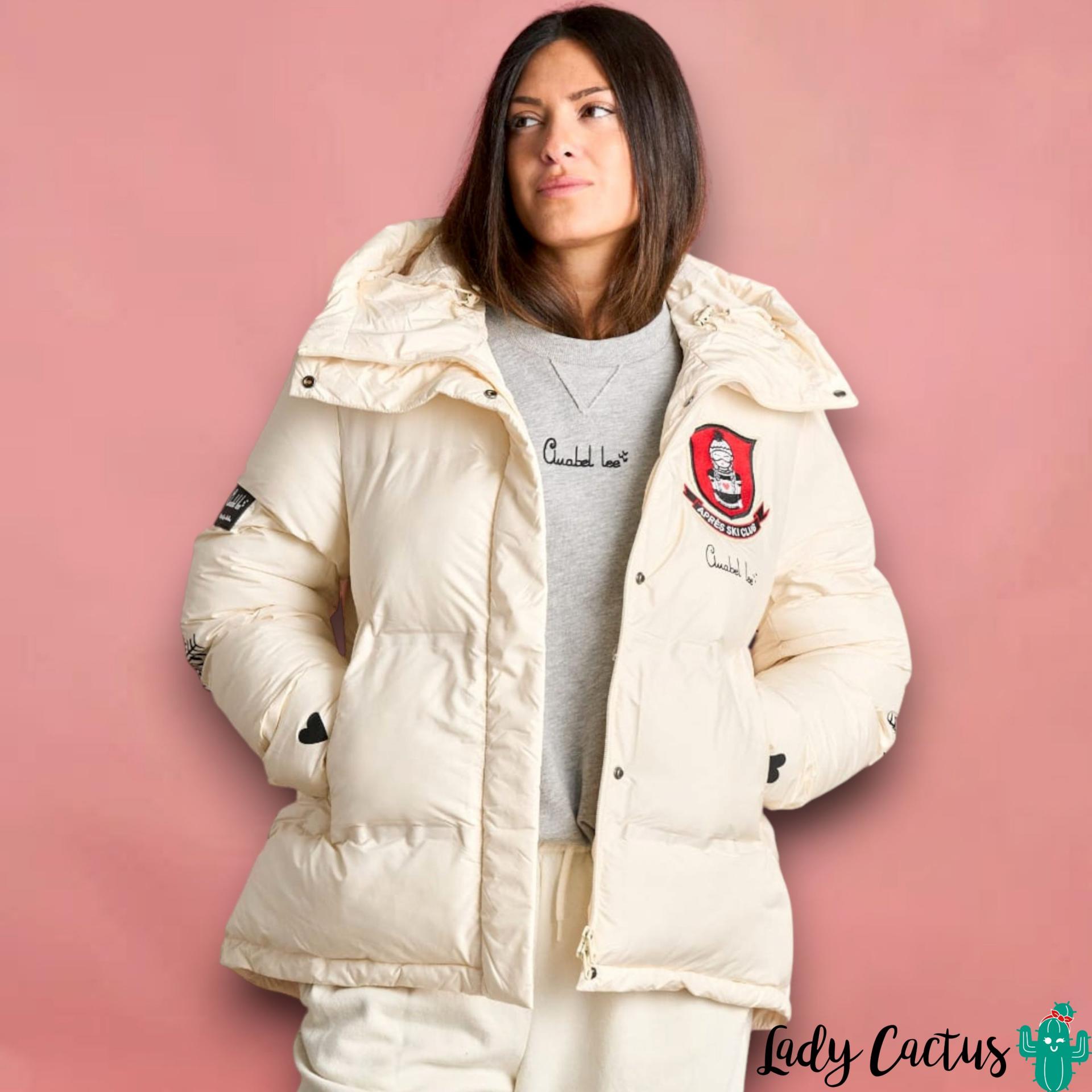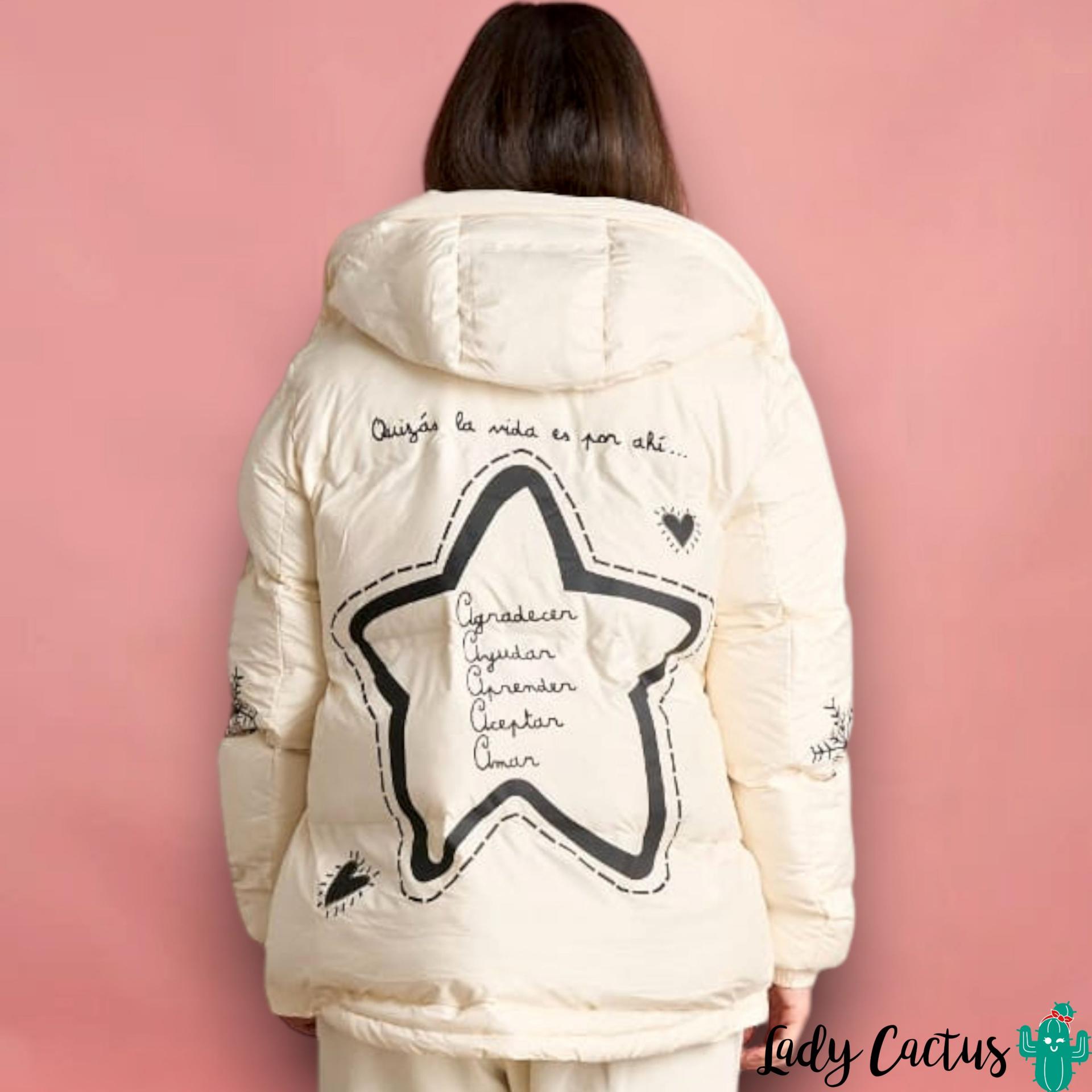 Plumífero Estrella Vida crudo de Anabel Lee: evasé con relleno Sorona ecológico, escudo bordado y frase inspiradora en espalda, cálido y versátil para un estilo poético español emocional y sostenible.