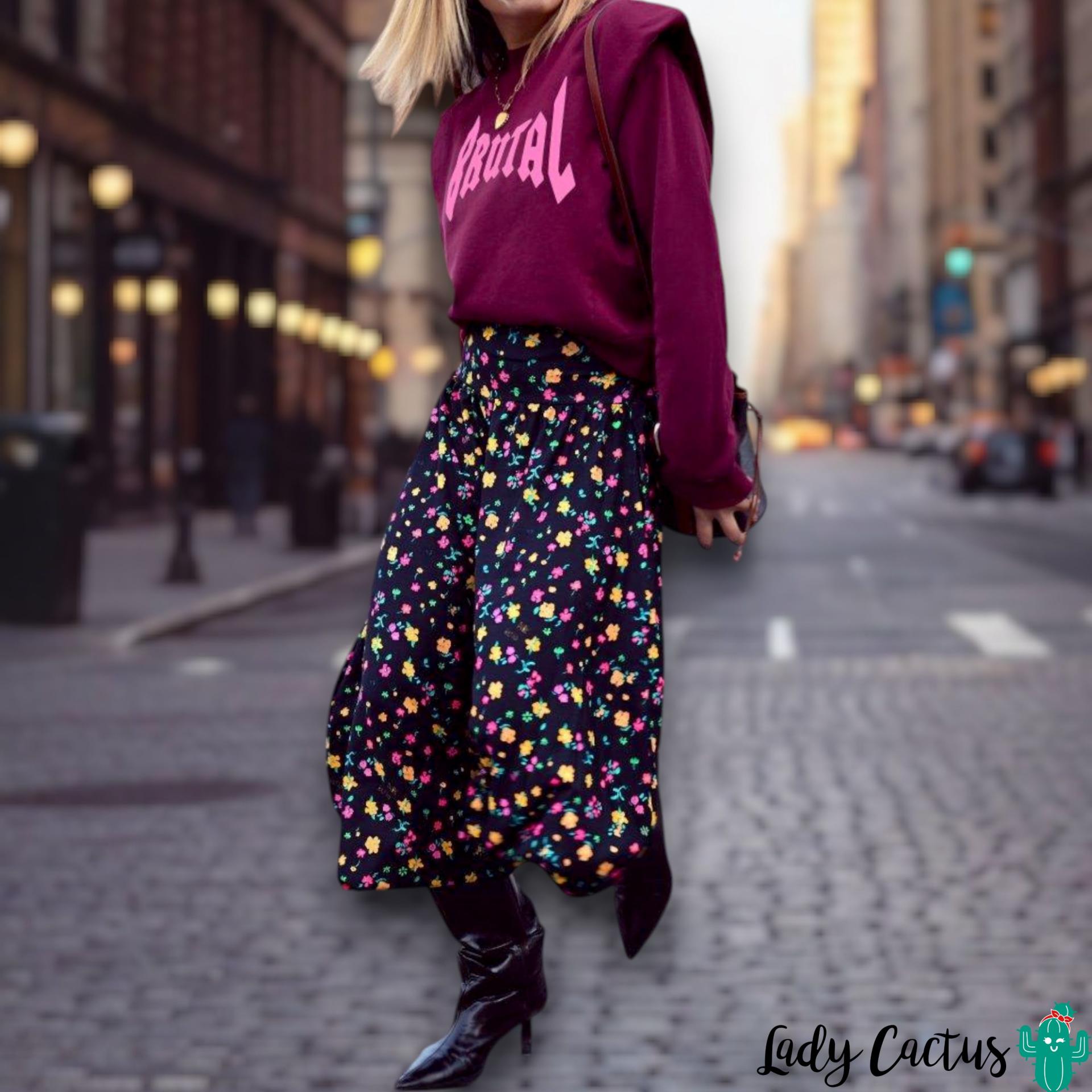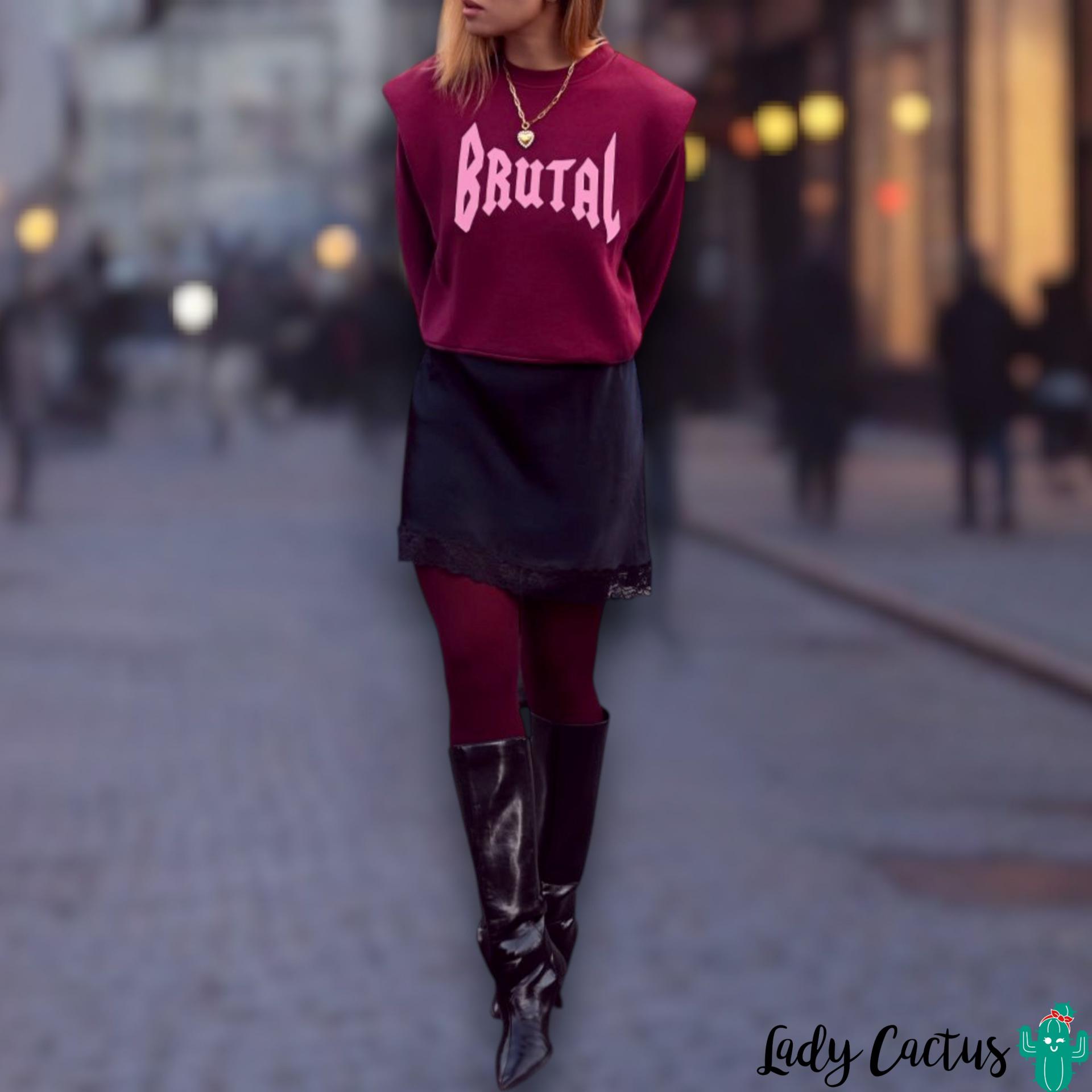 En el pulso intenso de las novedades Aire Retro, la sudadera burdeos Brutal se erige como un manifiesto de rebeldía ochentera que fusiona calidez con un toque indómito, capturando esa esencia artística y emocional que define la moda urbana española. Confeccionada en 100% algodón suave y transpirable, su felpa interior gustosa y calentita envuelve el cuerpo en un abrazo reconfortante que resiste el frío con gracia, mientras las mangas tipo murciélago y hombreras con volumen evocan una silueta retro que irradia actitud. La serigrafía rosa con efecto puff —"Brutal"— añade un brillo juguetón que despierta conexiones crudas, transformando lo cotidiano en declaración personal. Diseñada en los talleres creativos de España y fabricada con precisión artesanal en Portugal, esta sudadera Aire Retro de grosor medio (❤❤) invita a una moda sostenible que perdura lavado tras lavado, promoviendo un armario versátil que late con pasión sin agotarse. Violeta, midiendo 1.70 m y pesando 64 kg, la luce en talla S con esa gracia natural que eleva lo simple a lo magnético. Combínala con pantalones cargo en tonos neutros para un look diurno cargado de misterio y comodidad, o con faldas fluidas claras para un contraste femenino y dinámico que resalte su espíritu gamberro. Ideal para almas apasionadas que buscan ropa con diseño original, esta sudadera burdeos no solo abriga el cuerpo, sino que despierta emociones profundas, atrayendo miradas en calles empedradas o encuentros improvisados. Como emblema del nuevo Aire Retro, representa esa innovación fresca que une lo chic con lo cañero, ardiendo de autenticidad sin agotarse.