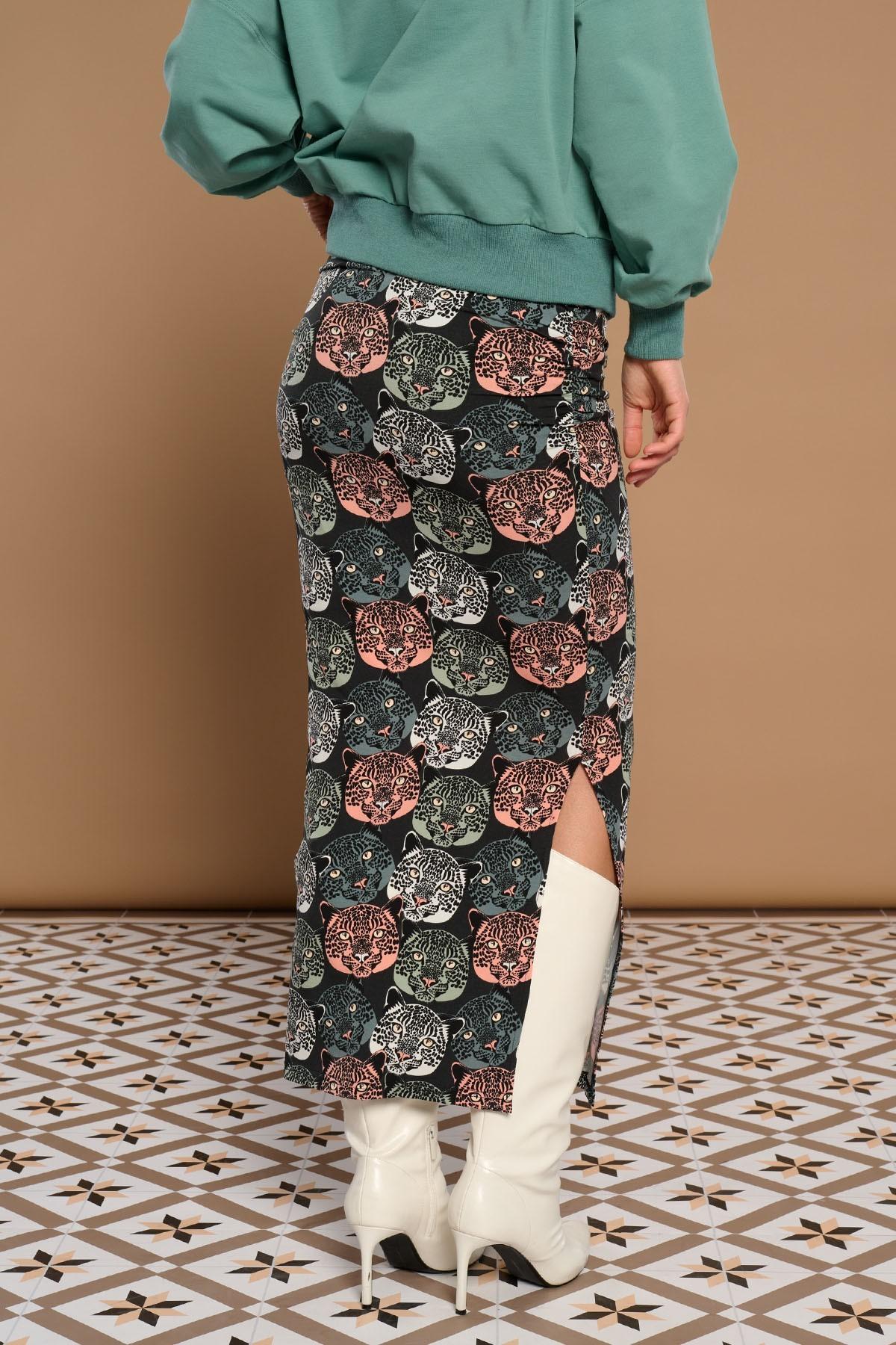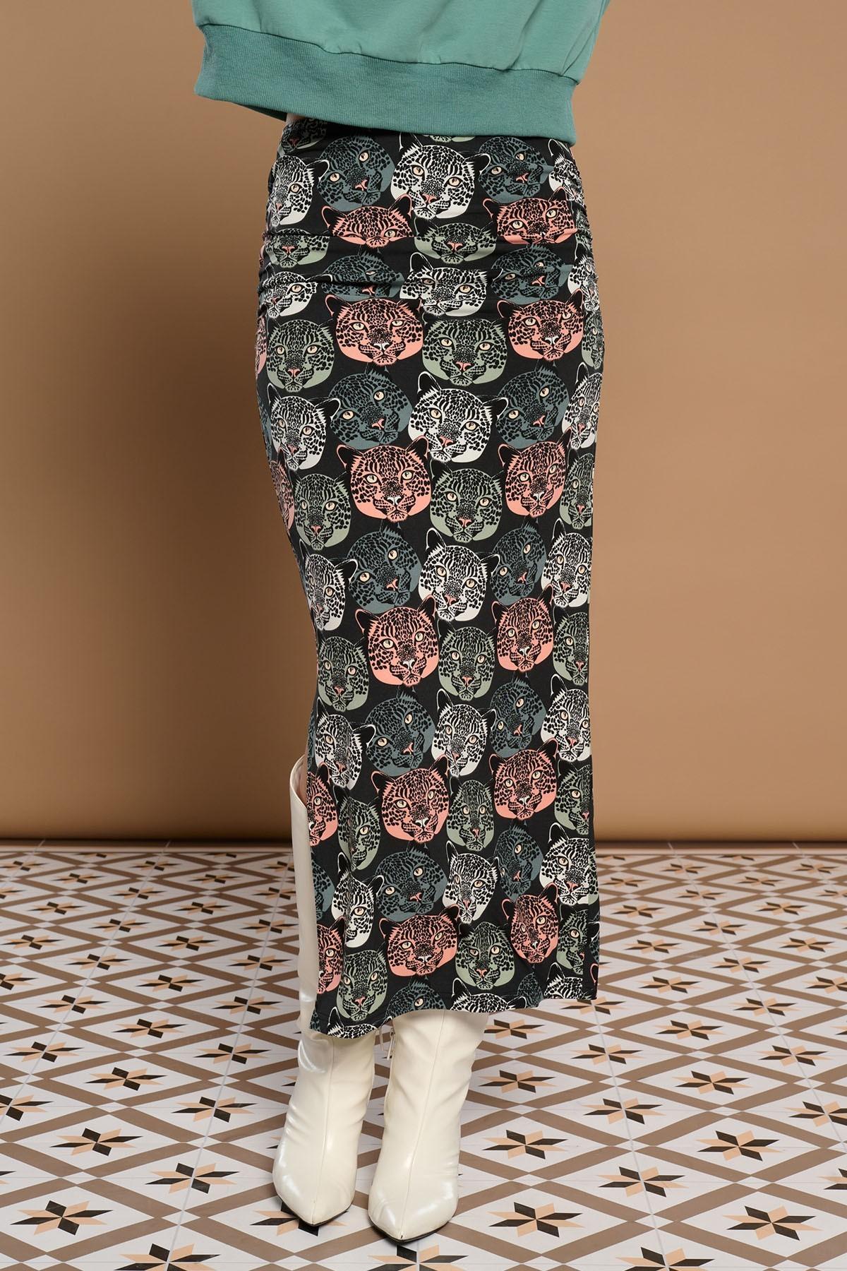 Falda larga con drapreado lateral. Estampado de guepardos en verdes, negros y salmón. Tejido elástico. Forro interior elástico.