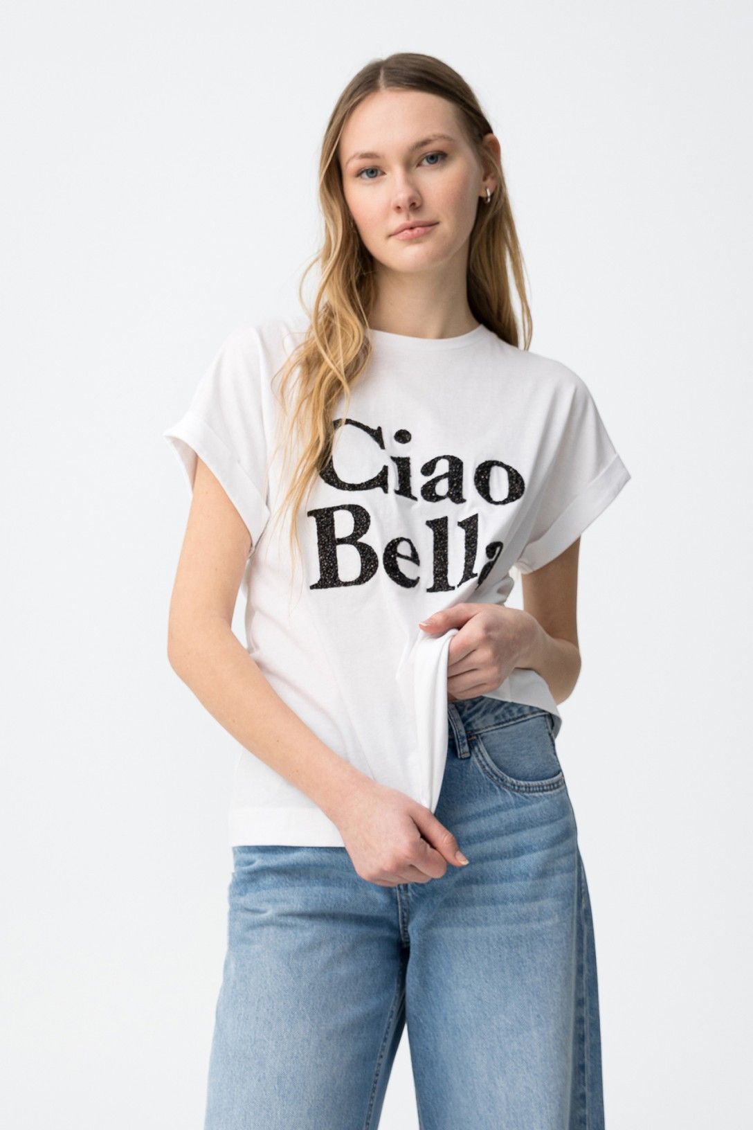 Camiseta de corte ancho, color blanco y texto Ciao Bella, abertura trasera con fruncido y lazada.