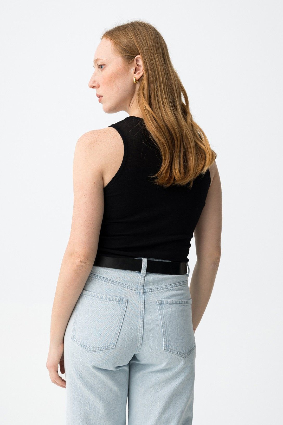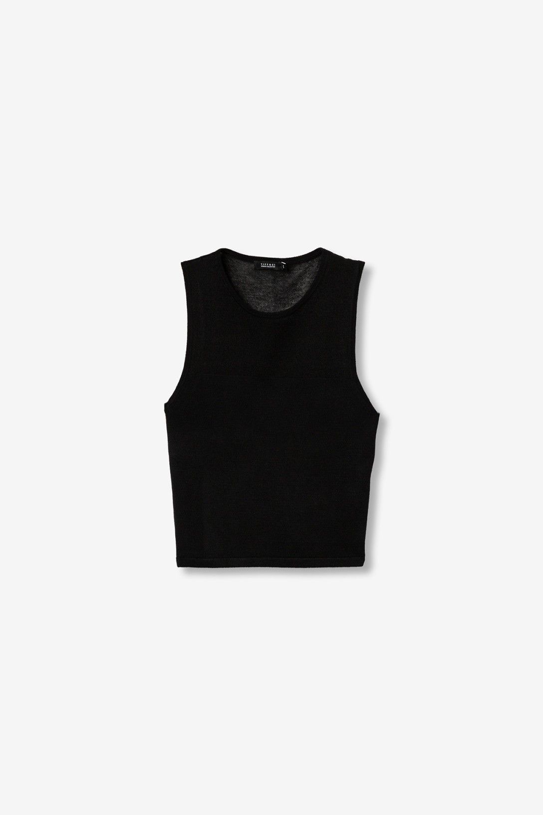 Top de color negro, corte ajustado, sin mangas, escote redondo y detalle transparente en el pecho.
