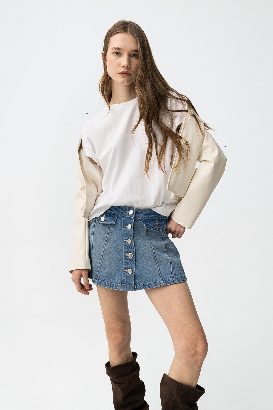Minifalda de denim azul, corte regular, botones metálicos delante y bolsillos traseros, rollo casual.