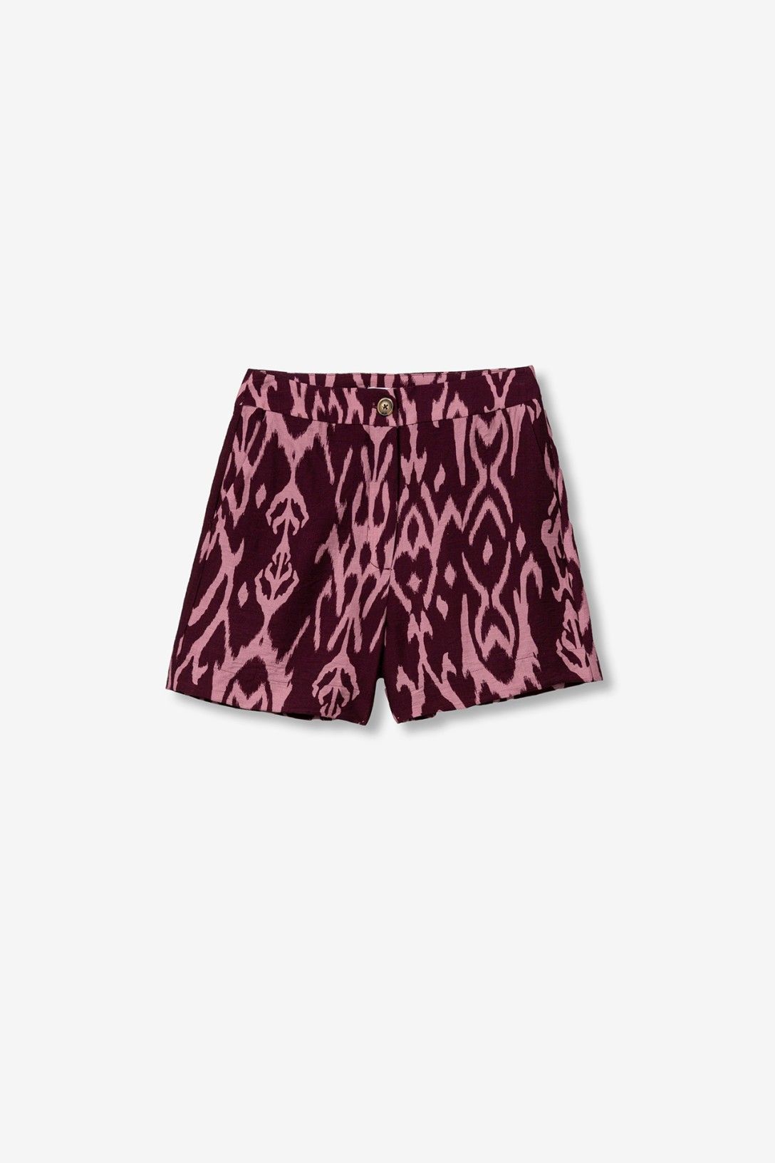 Shorts de corte regular, cintura alta, cierre frontal y estampado geométrico en tonos rojo y rosa.
