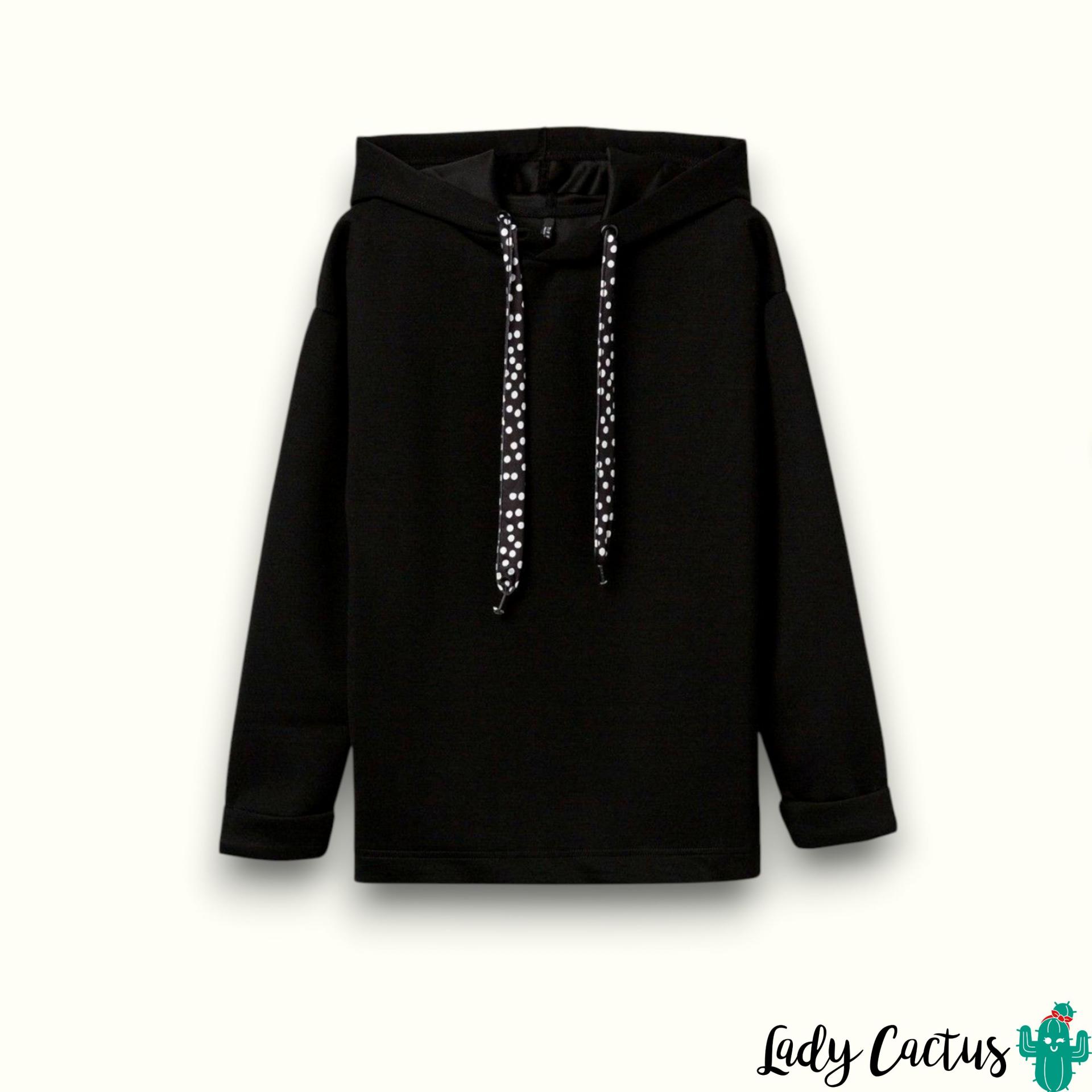 Con un favorecedor corte regular fit, esta sudadera en un elegante color negro es ideal para cualquier ocasión. Su diseño se destaca por su versatilidad y suavidad. Cuenta con una capucha ajustable con un cordón estampado que le da un toque sutil pero distintivo. Las mangas largas y los acabados en los puños y el bajo aseguran un ajuste perfecto para una total libertad de movimiento.