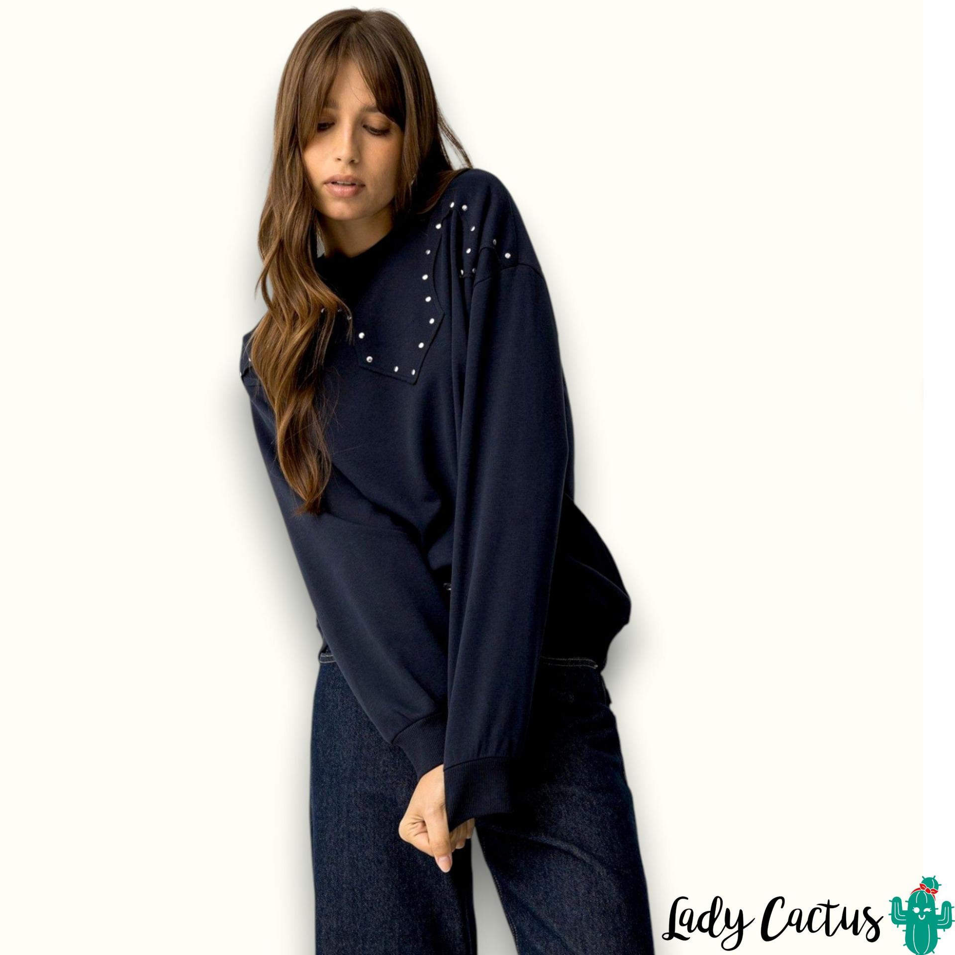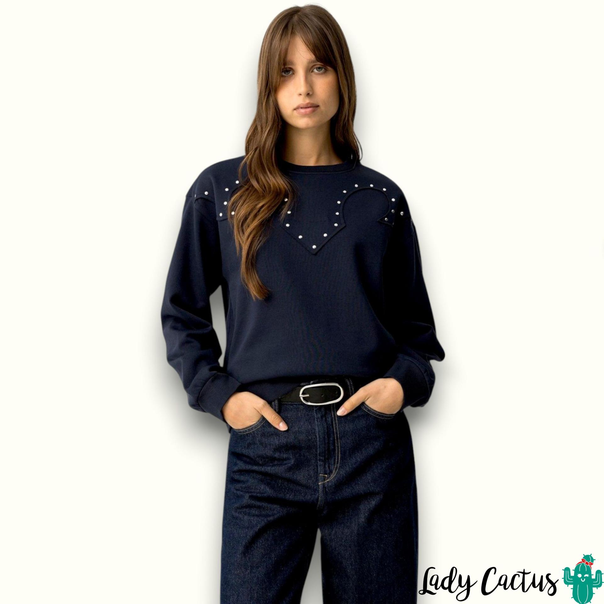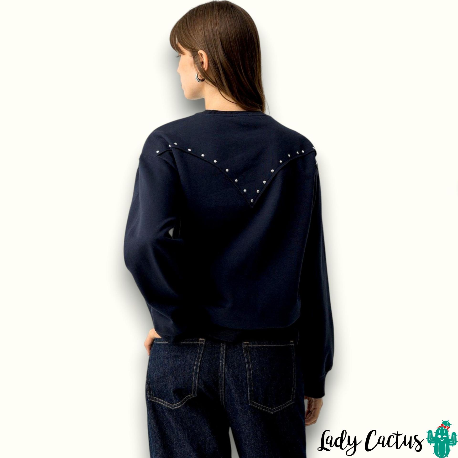 Con un favorecedor corte regular fit, esta sudadera en un profundo y elegante color Lyons Blue se adapta a la perfección a tu silueta. Su diseño destaca por los apliques metálicos en forma de V en el pecho y la espalda, que le dan un toque audaz y único. Cuenta con un clásico escote redondo y manga larga con acabados en canalé, que aseguran un ajuste perfecto. Su suave interior afelpado la convierte en la opción ideal para estar abrigada y cómoda en los días más frescos.