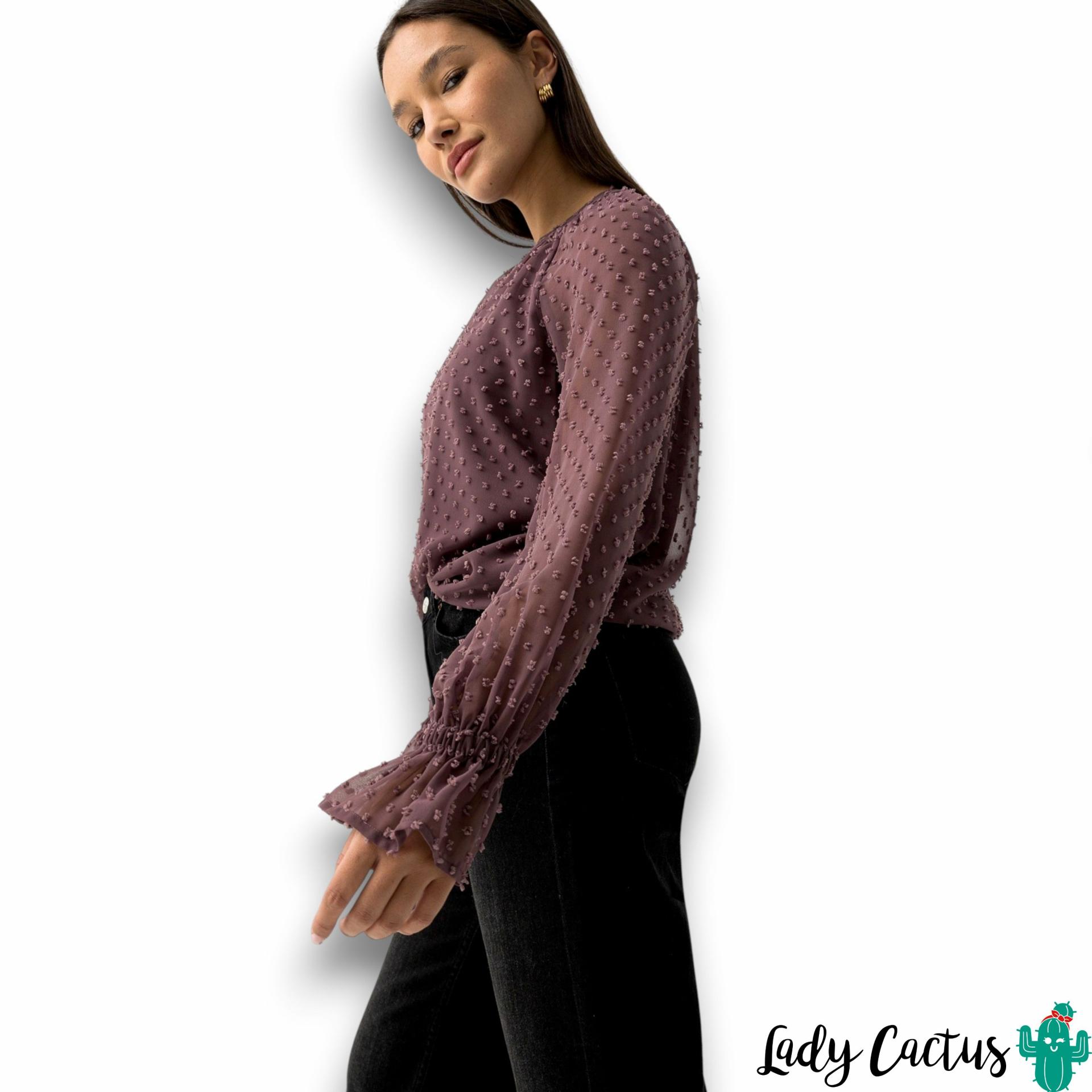 La blusa Laurinda de Tiffosi es delicada y versátil, ideal para crear looks femeninos con un toque romántico. Confeccionada en tejido ligero y transparente, su textura plumeti y las mangas largas con volantes le aportan un aire sofisticado.