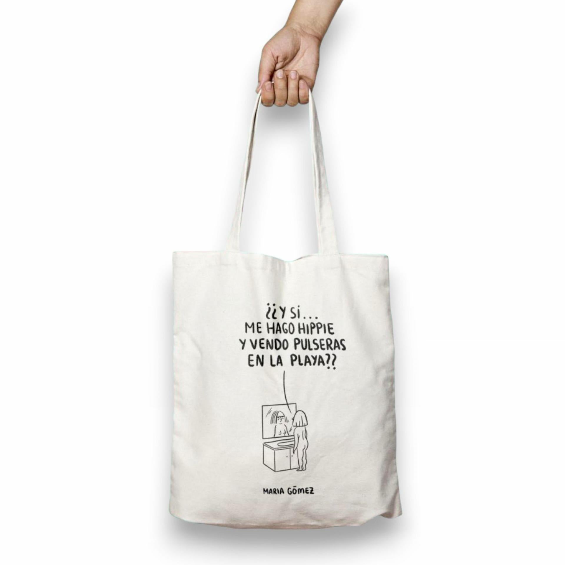 ¿Te has planteado alguna vez dejarlo todo y vivir una vida más libre y natural? Entonces esta tote bag es para ti. La tote bag hippie es una bolsa de tela divertida y original, que muestra una ilustración de una mujer mirándose al espejo y el texto “¿¿y si me hago hippie y vendo pulseras en la playa??”. Es una bolsa de algodón de alta calidad, con un diseño de María Gómez, una ilustradora que habla con humor y frescura de feminismo, amor, sexo, gatos y más. La tote bag hippie tiene un tamaño ideal para llevar tus cosas, con unas medidas de 41 x 37 cm y dos asas cómodas. Es una bolsa ecológica y reutilizable, que puedes lavar y planchar sin problemas. La tote bag hippie es un regalo perfecto para ti o para esa amiga que siempre sueña con escaparse a la playa. Es un producto de Lady Cactus, una tienda online que te ofrece productos de moda con personalidad y estilo.