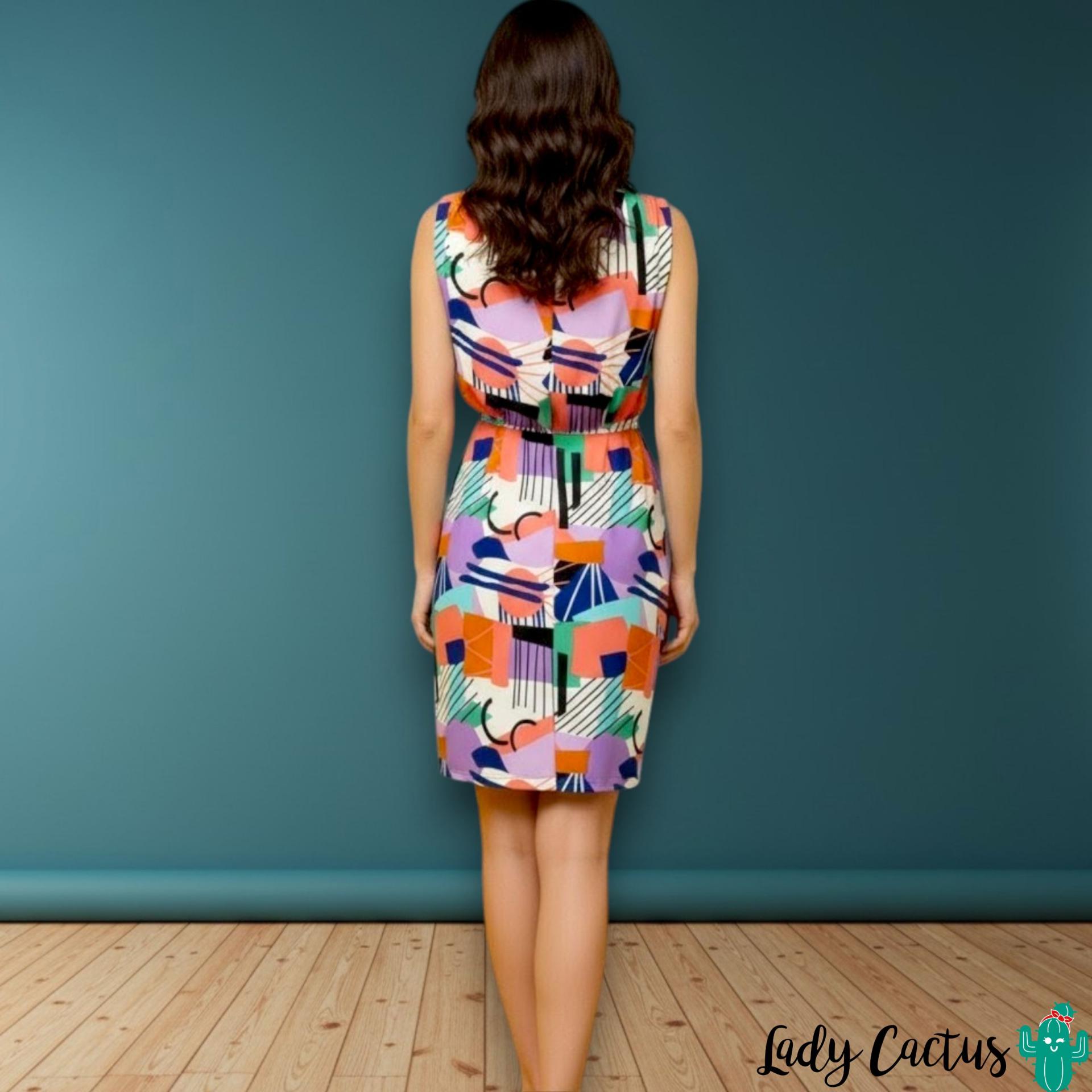 Este vestido de corte corto presenta un diseño con cuello redondo y manga sisa, ideal para los días más cálidos. Su silueta se ajusta a la cintura para realzar la figura, mientras que el vibrante estampado Mix añade un toque de alegría y originalidad. Incorpora un práctico cierre trasero con cremallera oculta en costura, lo que garantiza un acabado impecable.