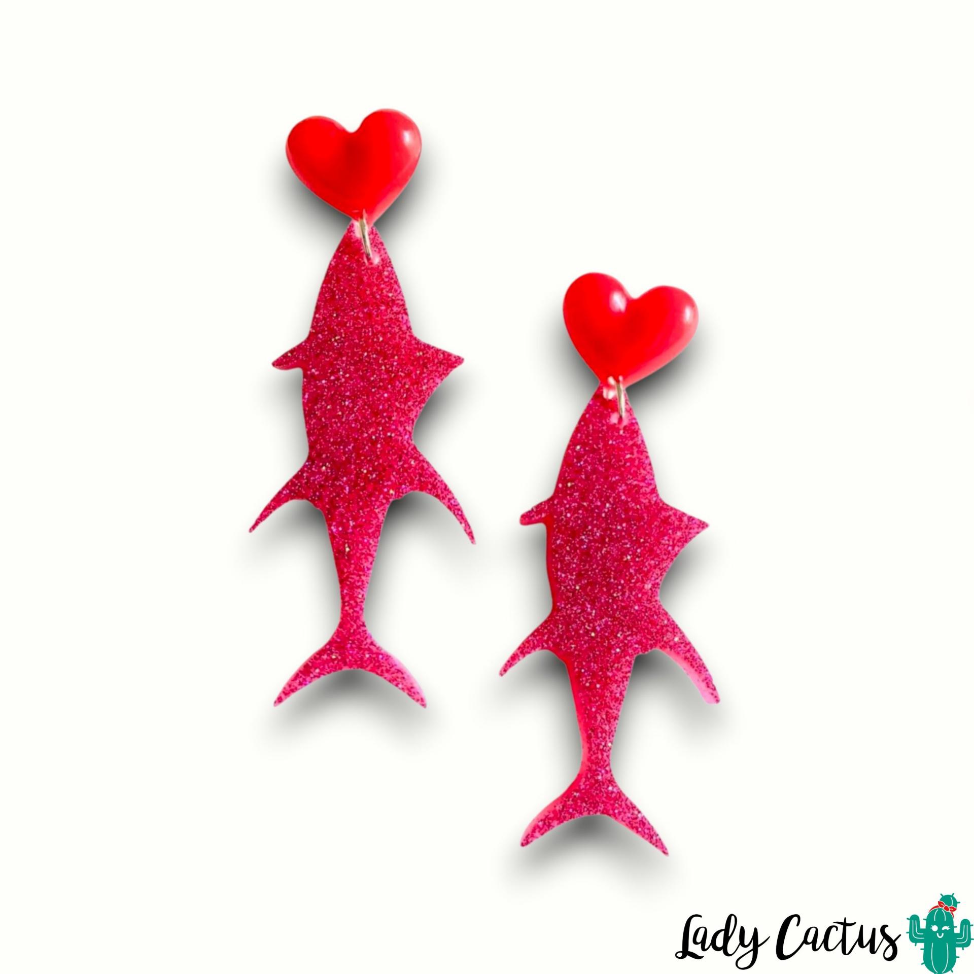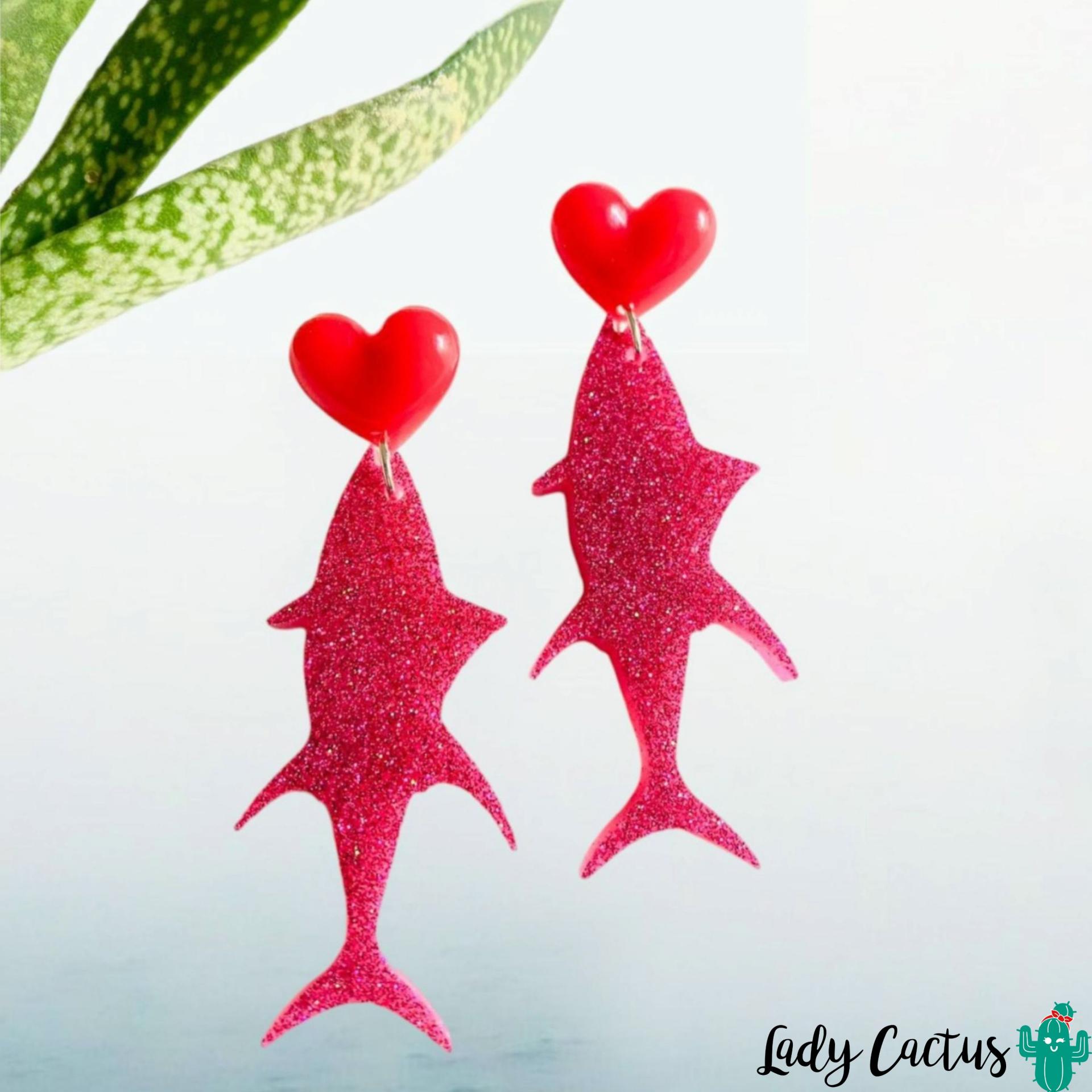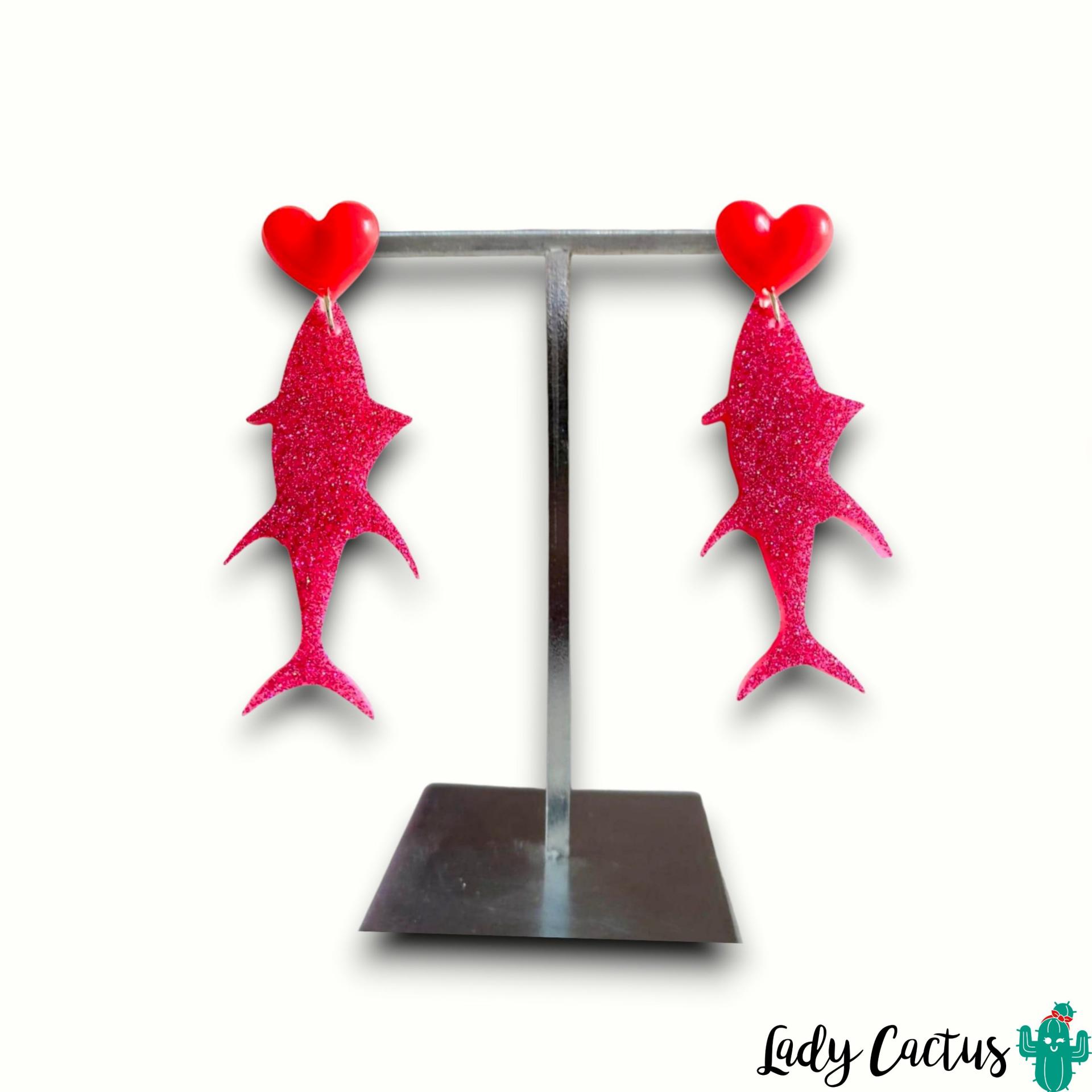 Pendientes Pez Amor Rosa de Lady Cactus: resina epoxi handmade con pez y corazón rojo, 5 cm ligeros en acero, veraniegos para joyería sevillana urbana y dulce.