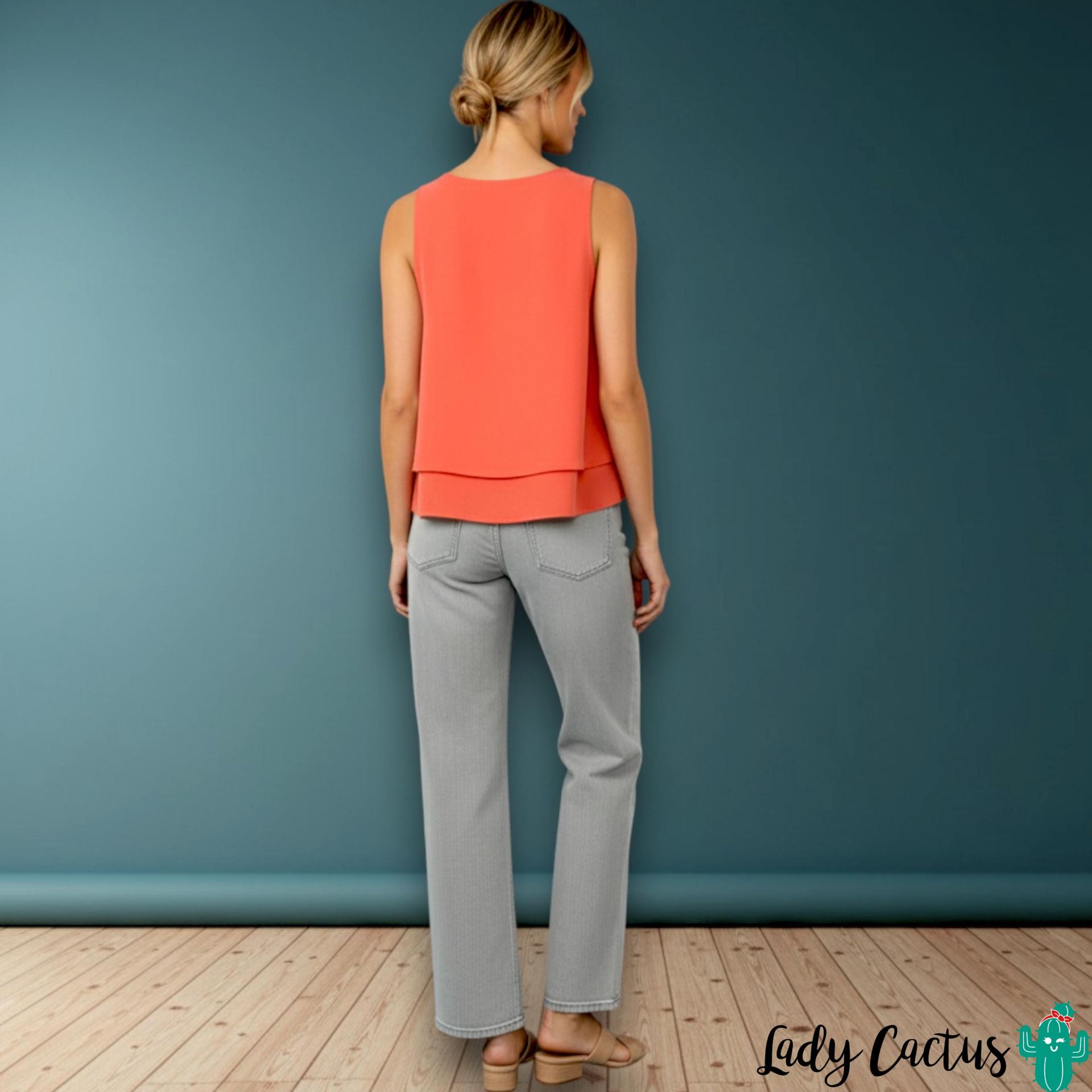 Blusa Coral de Tiffosi, ligera y fresca, con vuelo en el bajo y cierre trasero. Combinado con los Pantalones Vaqueros Bonnye de Tiffosi.