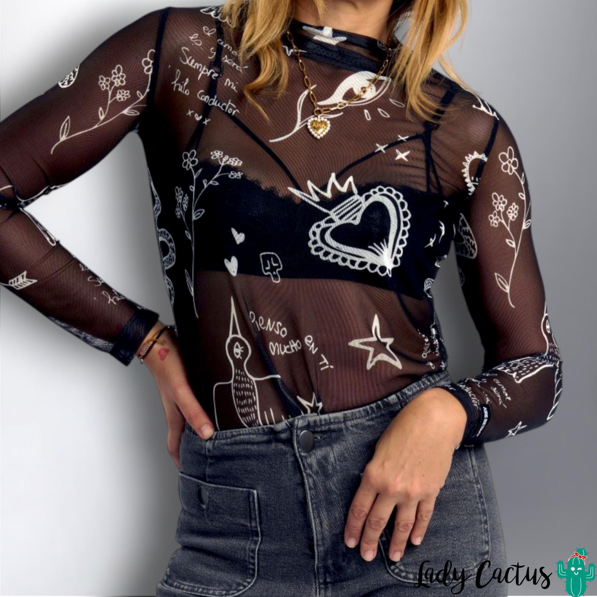 La camiseta Tul Poemas de Aire Retro es pura expresión creativa. Confeccionada en un tejido de tul elástico (93% poliéster, 7% elastano), se adapta como una segunda piel aportando comodidad y estilo. Es una prenda llamativa y versátil, pensada para combinar con vaqueros de tiro alto, faldas satinadas o incluso como base para looks en capas.