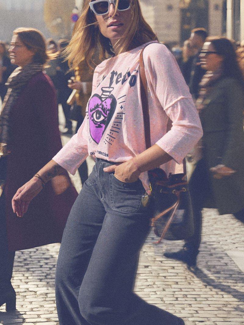 Camiseta rosa jaspeada, con ilustración Salvaje de Corazón, todo el estilo bohemio & rock and roll que necesitas junto!