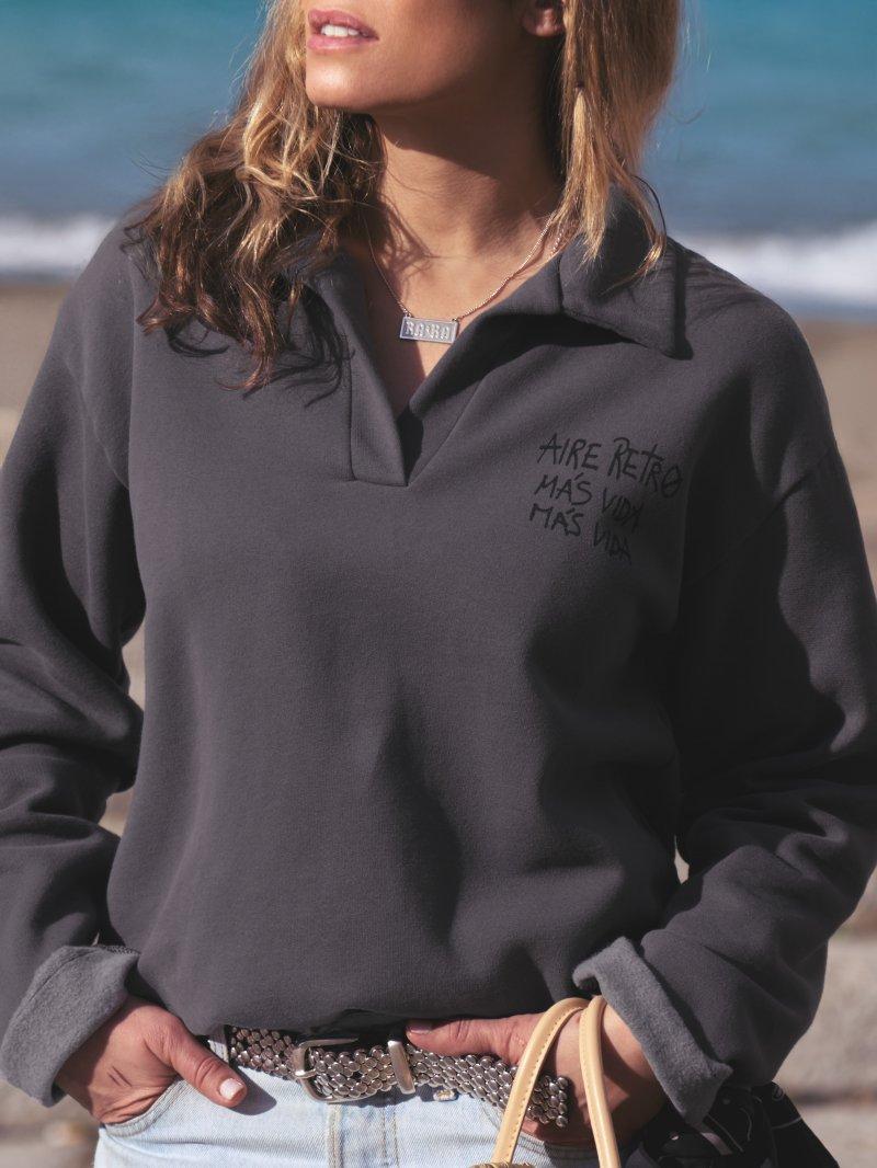 Sudadera tipo polo de algodón gris con cuellos, tiene ilustración delantera y trasera de Dale más vida a tu tiempo.