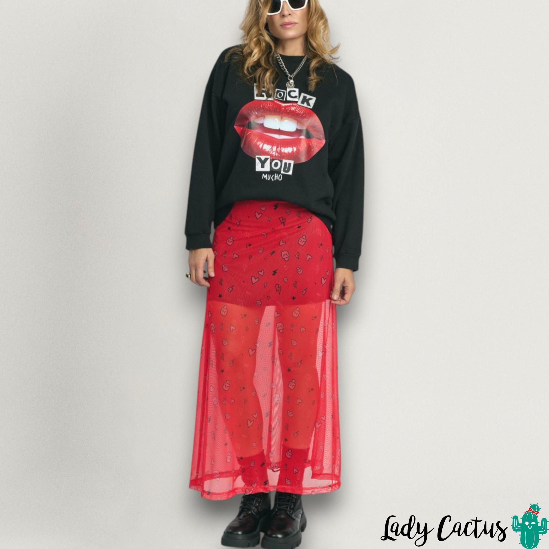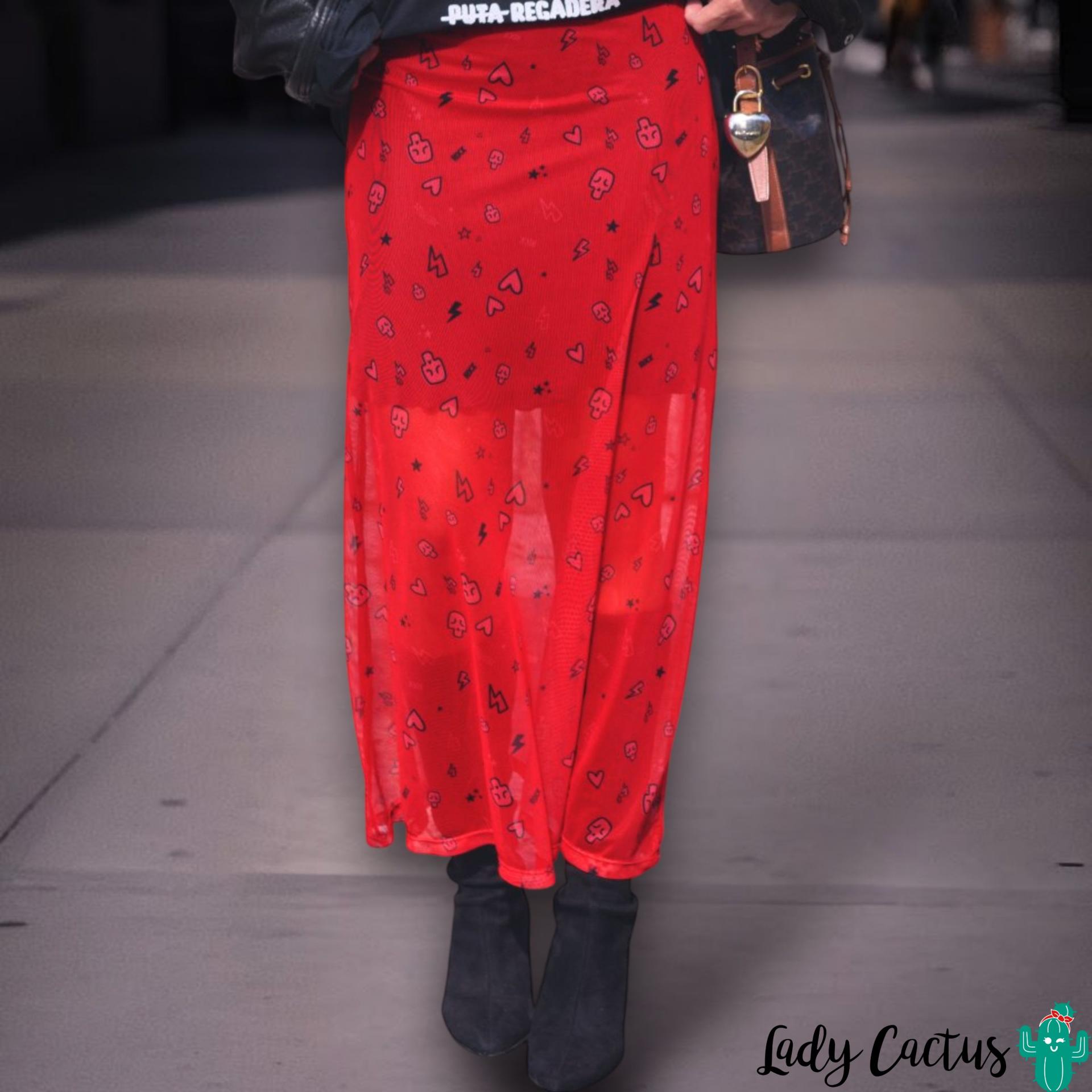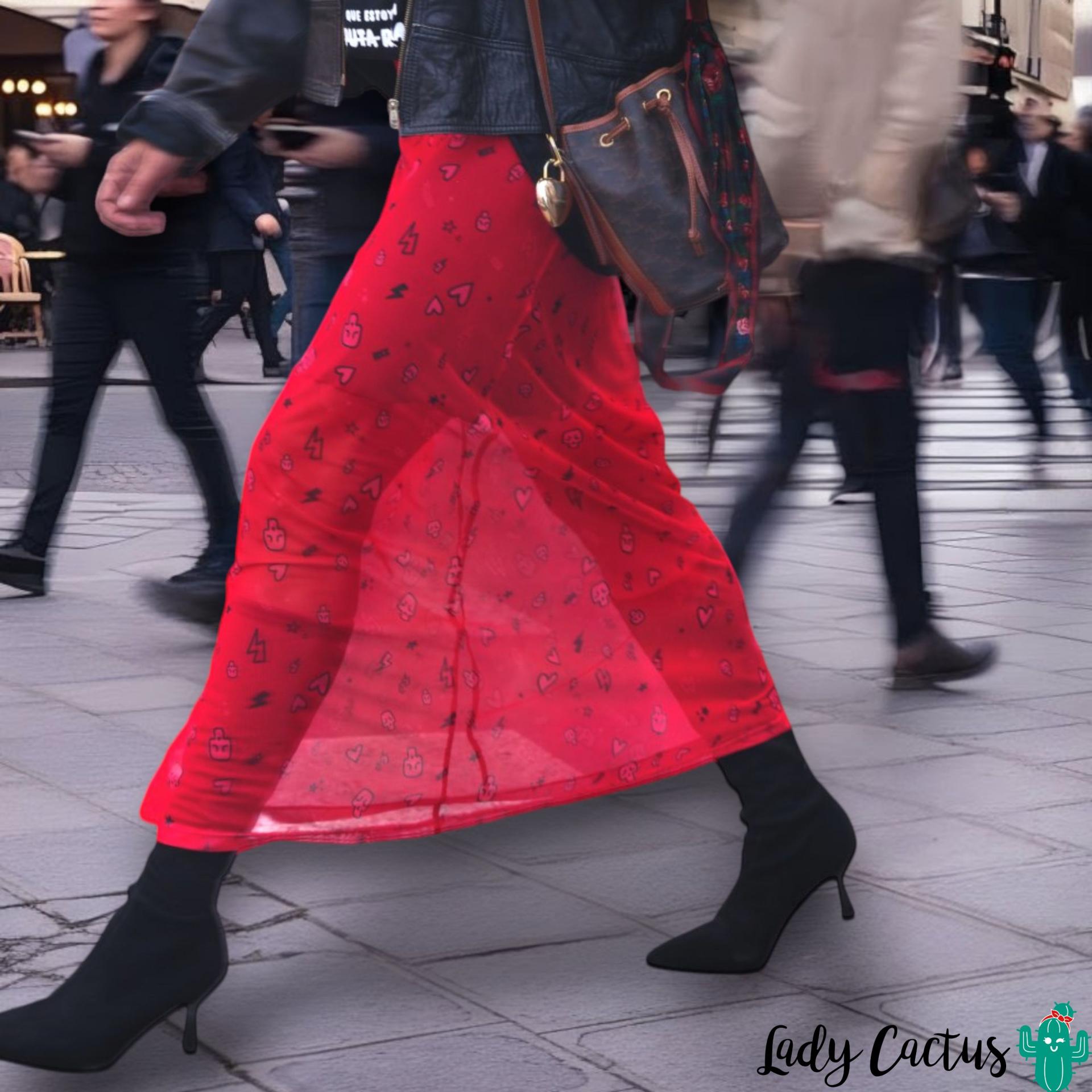 Falda tul Sara roja de Aire Retro: poliéster largo con total print y forro hasta rodilla, diseño sexy-chic fluido para un estilo urbano español rebelde y elegante.