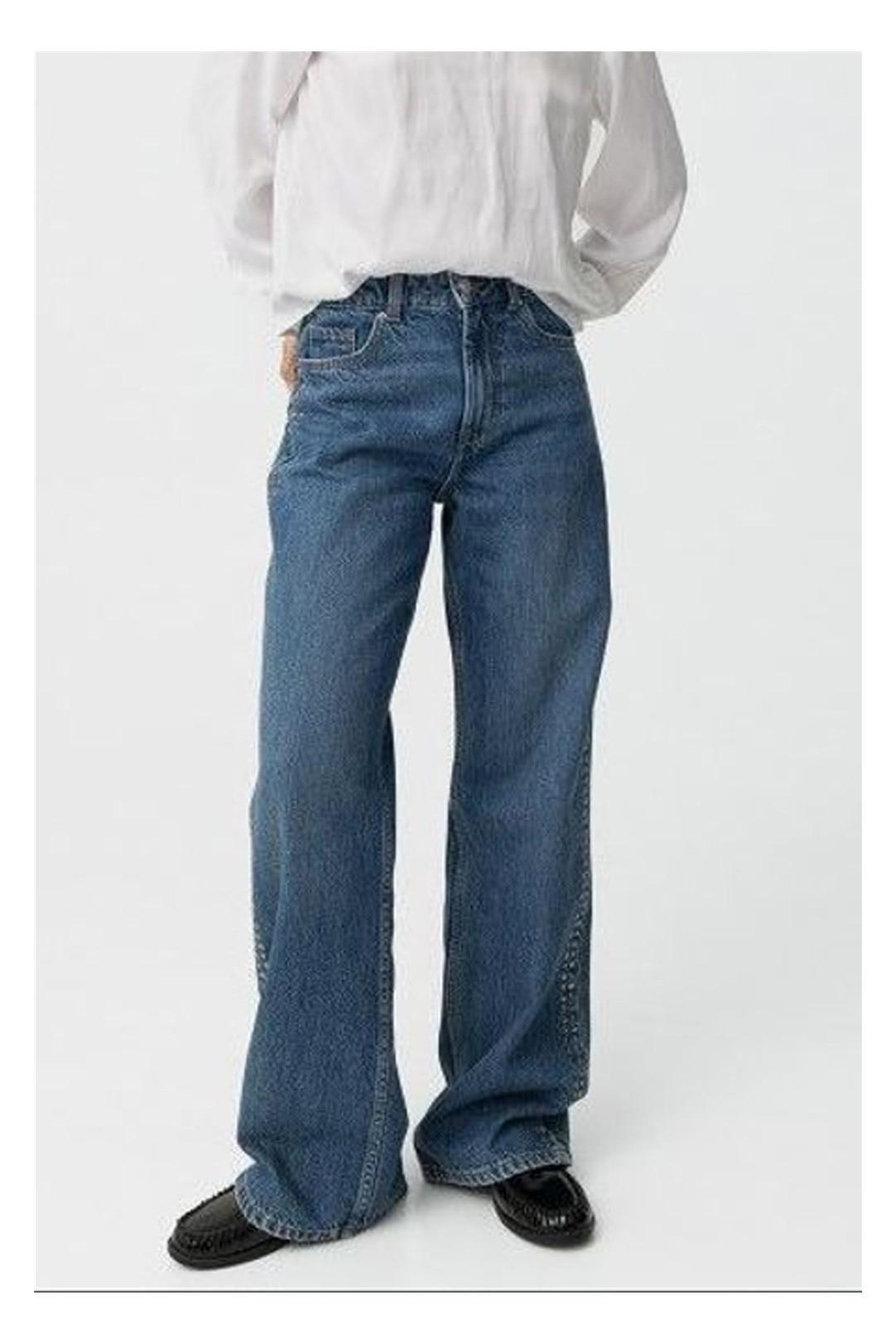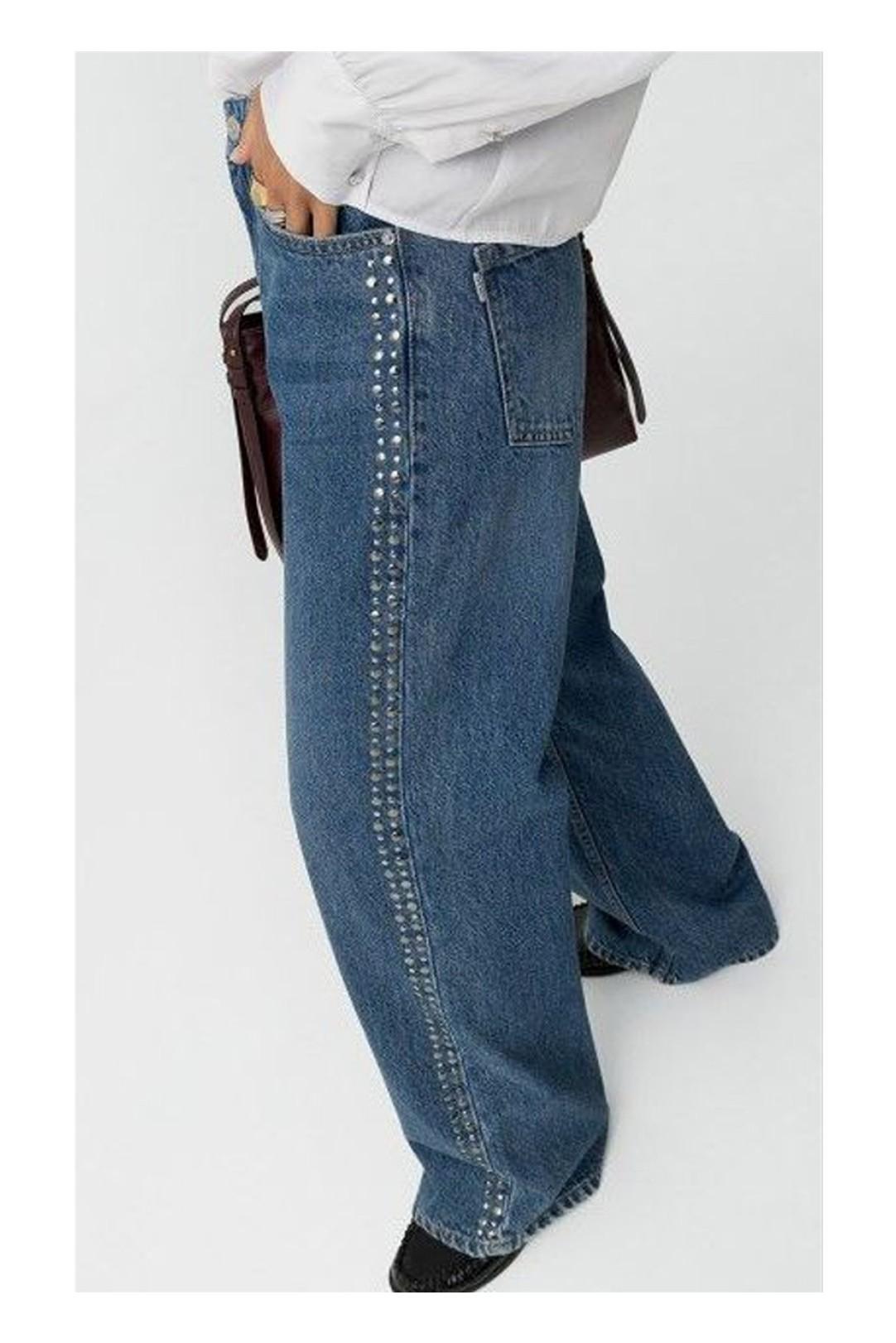 Pantalón vaquro de color azun medio y tachas en los laterales , el color plateado.
