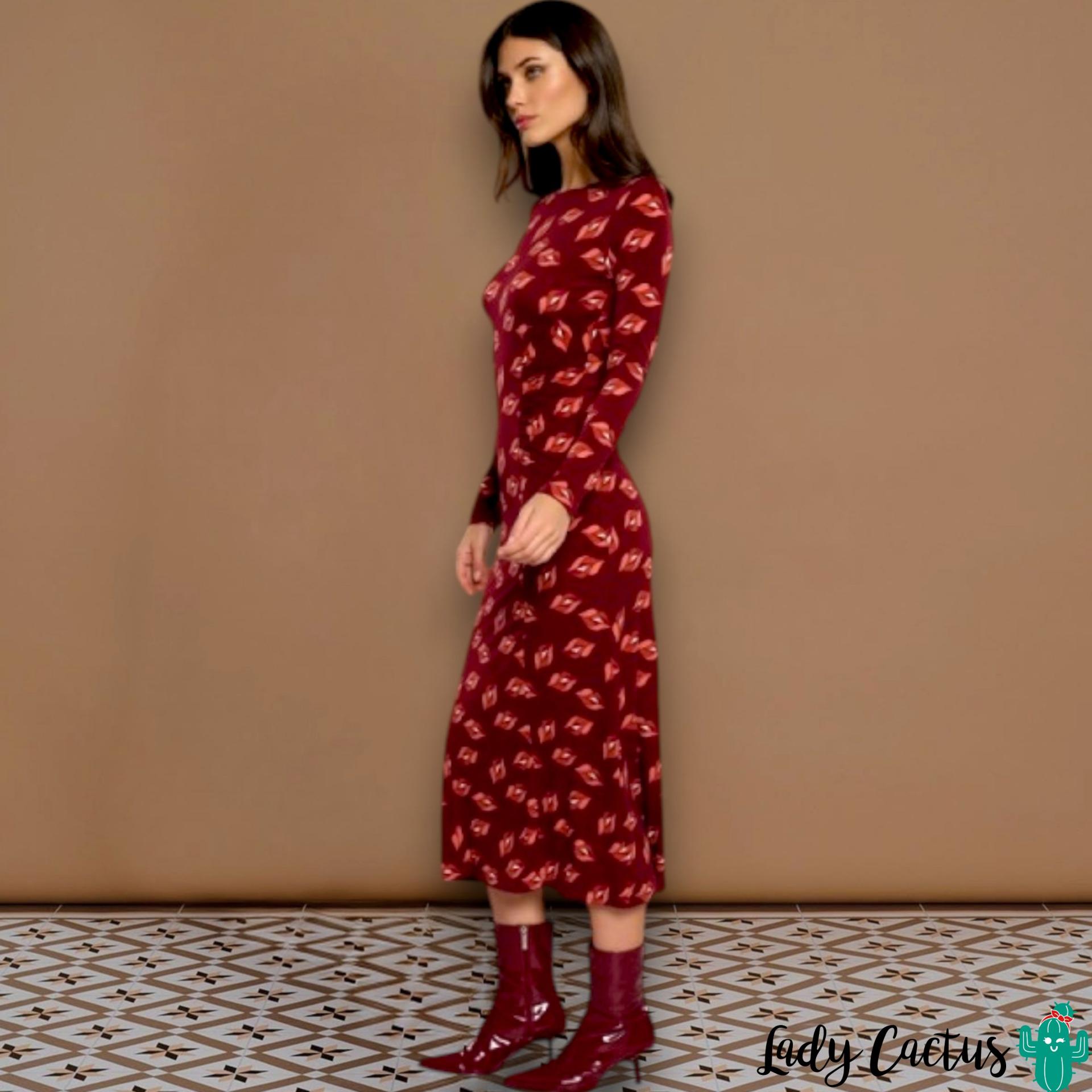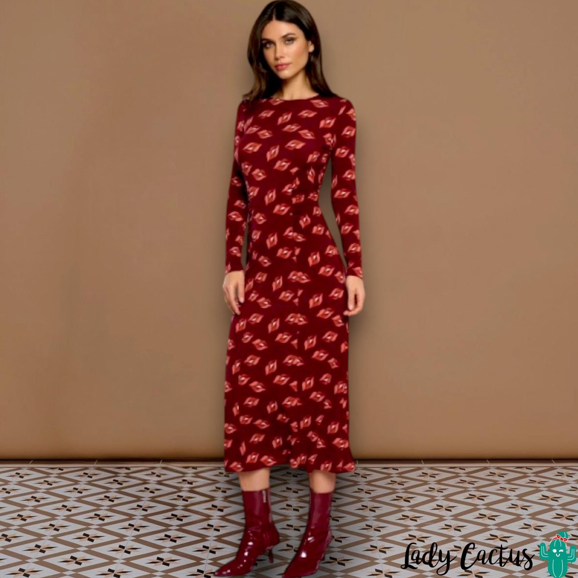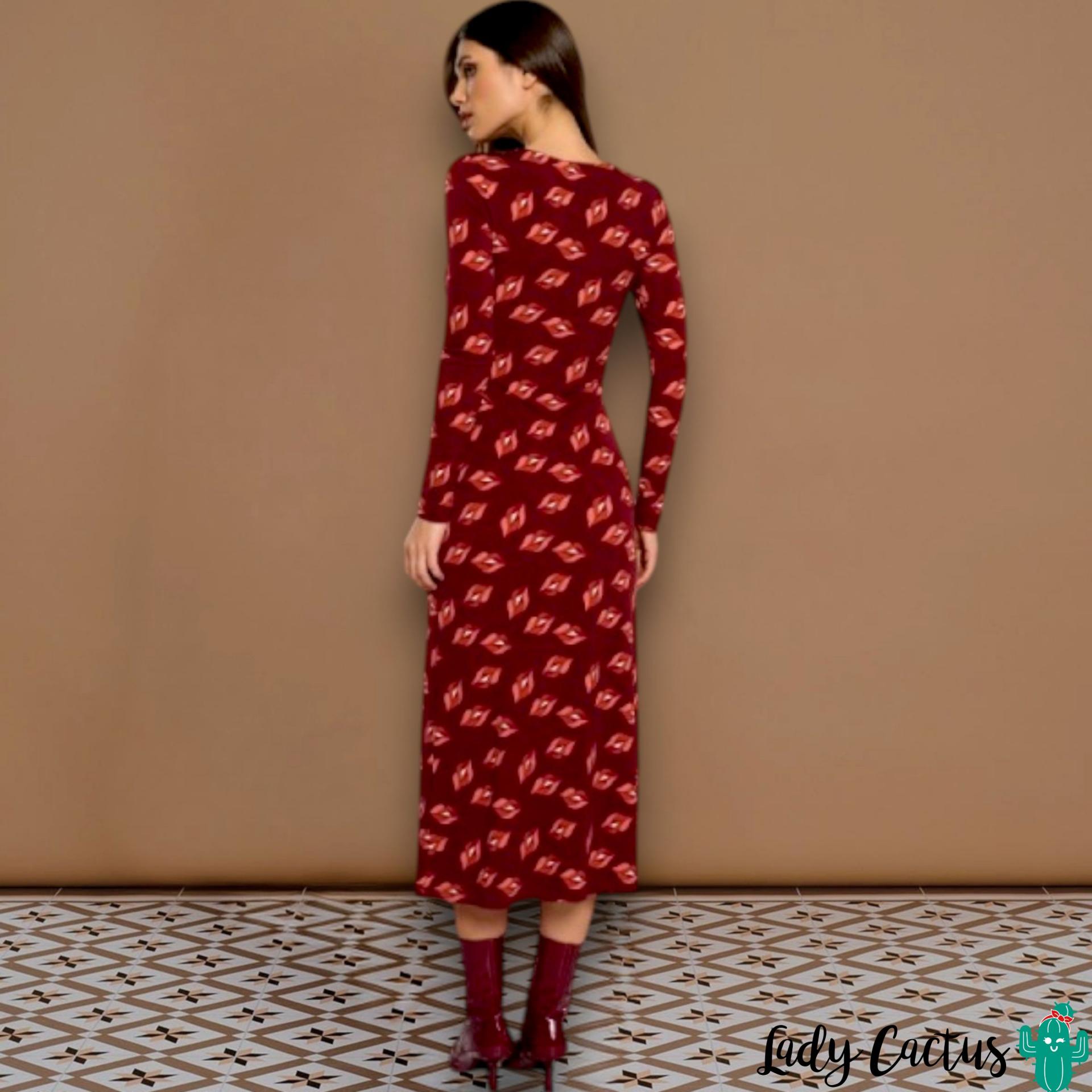Vestido Raffaella granate de Minueto: elástico midi con estampado labios y fruncidos laterales, fluido y apasionado para un estilo colorido y versátil.