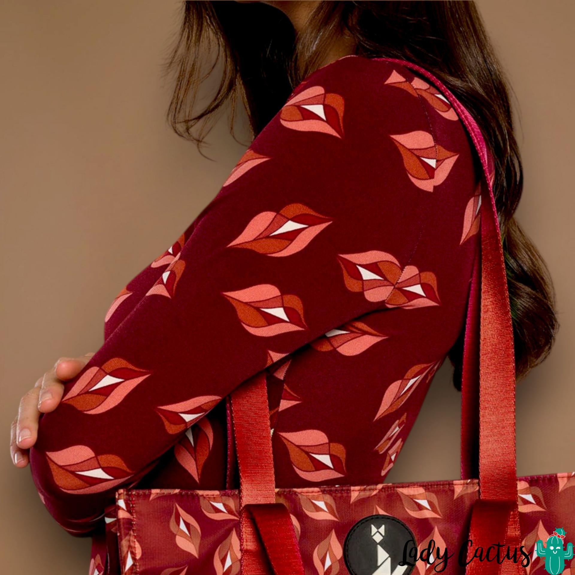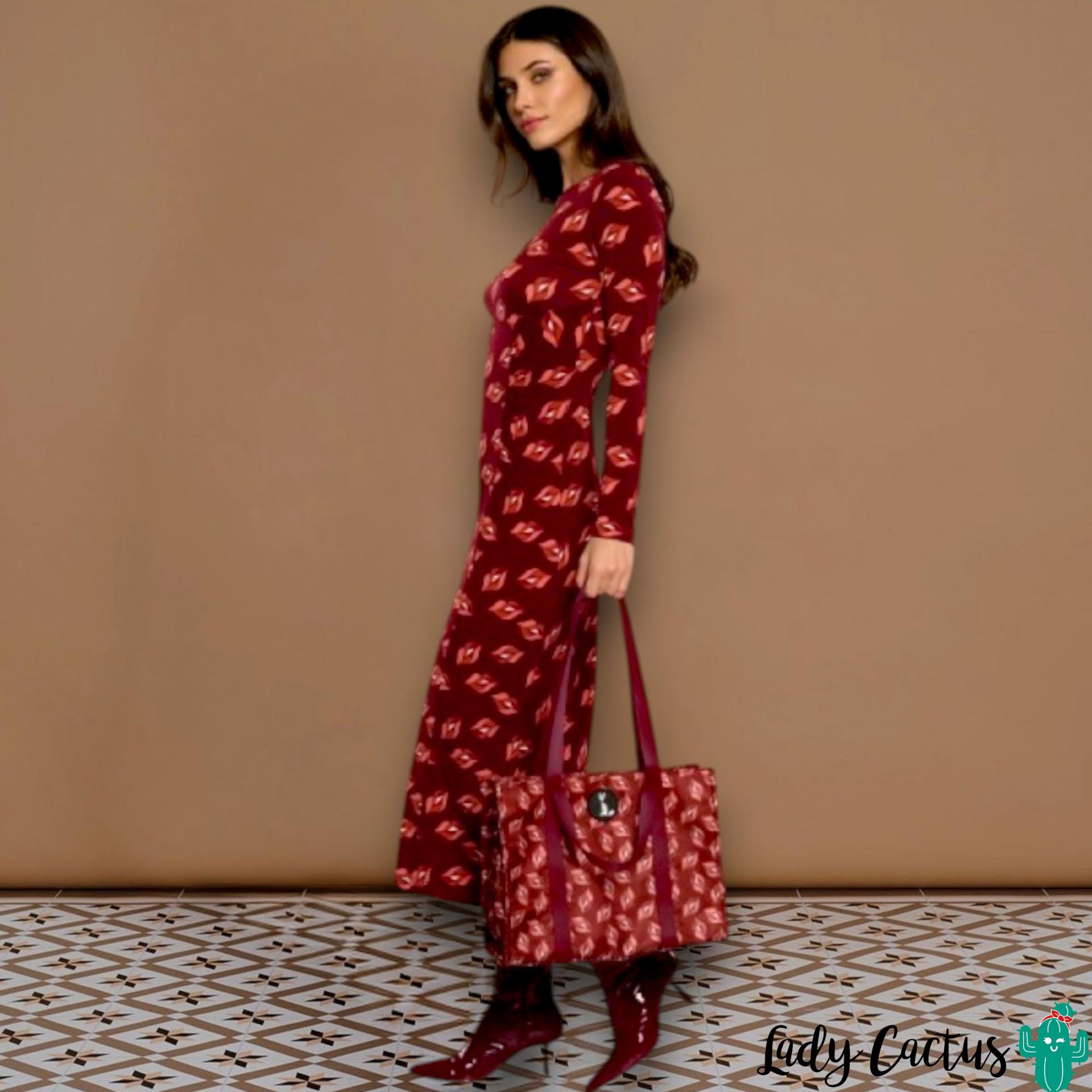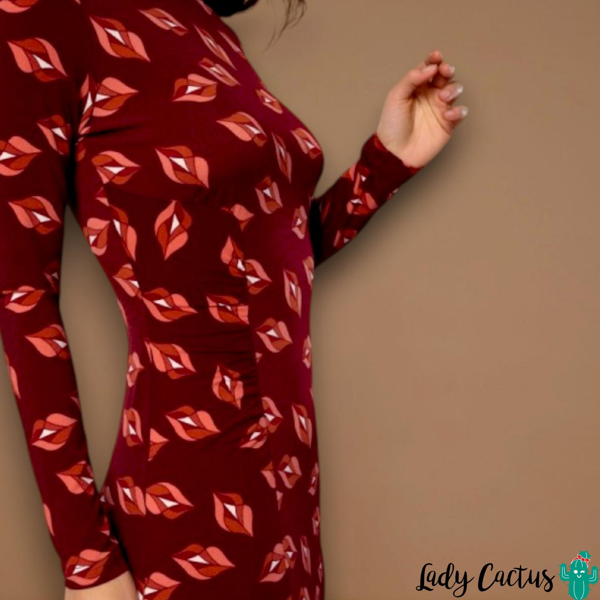Vestido Raffaella granate de Minueto: elástico midi con estampado labios y fruncidos laterales, fluido y apasionado para un estilo colorido y versátil.