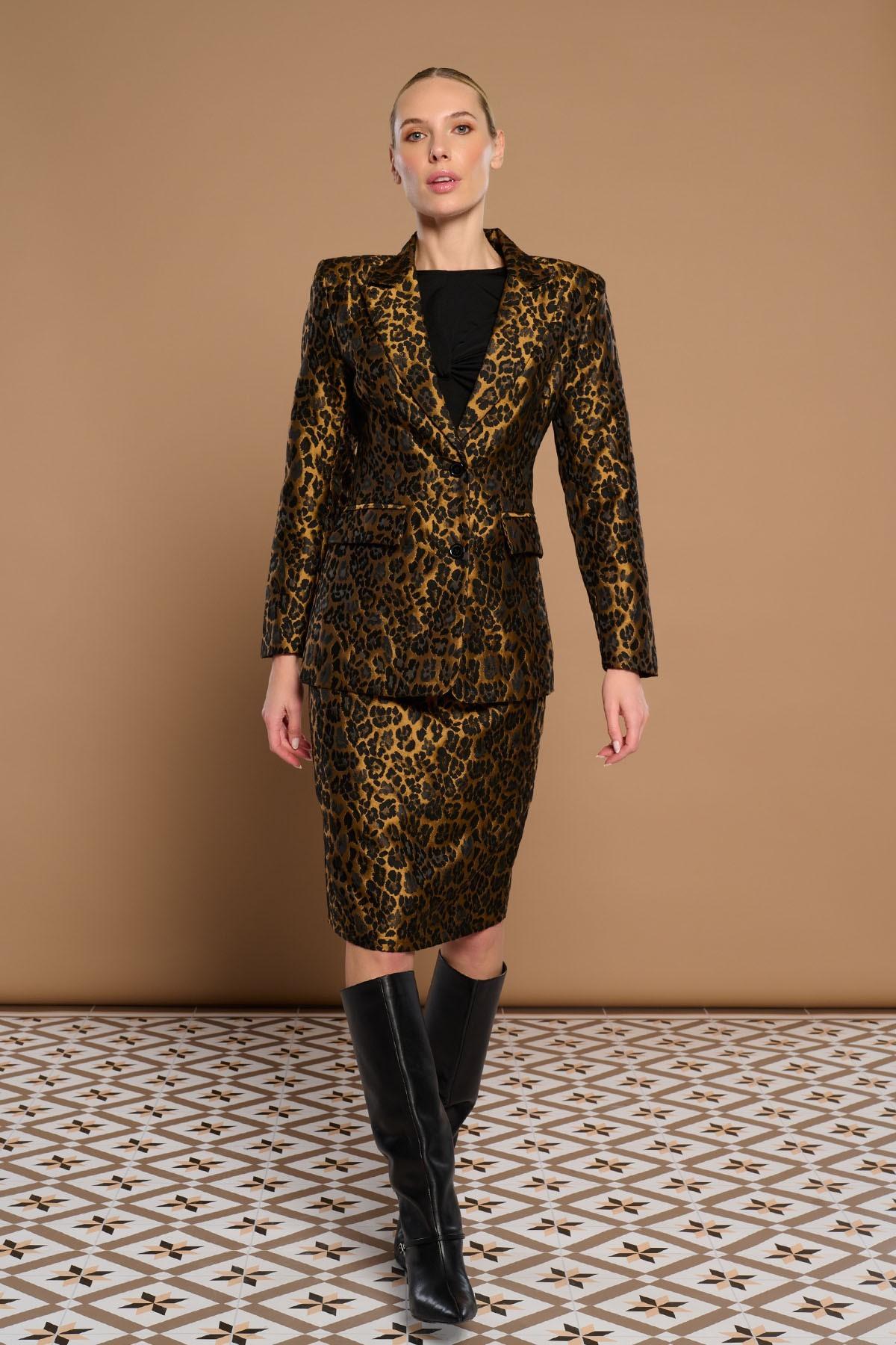 Blazer de cuello solapa y manga larga con hombreras. Bolsillos delanteros de vivo. Cierre frontal cruzado con botones. Forro interior. Estampado animal print satinado.
