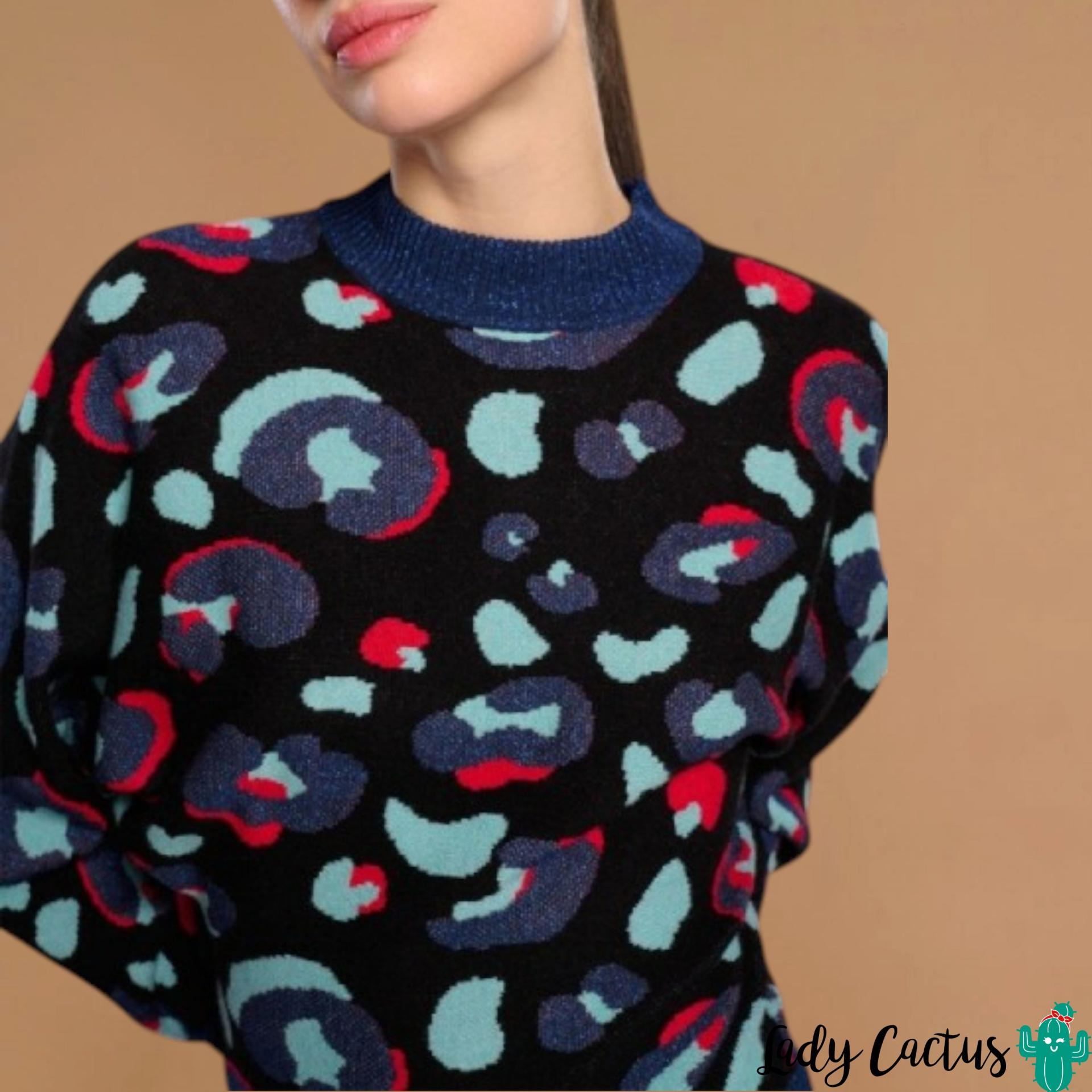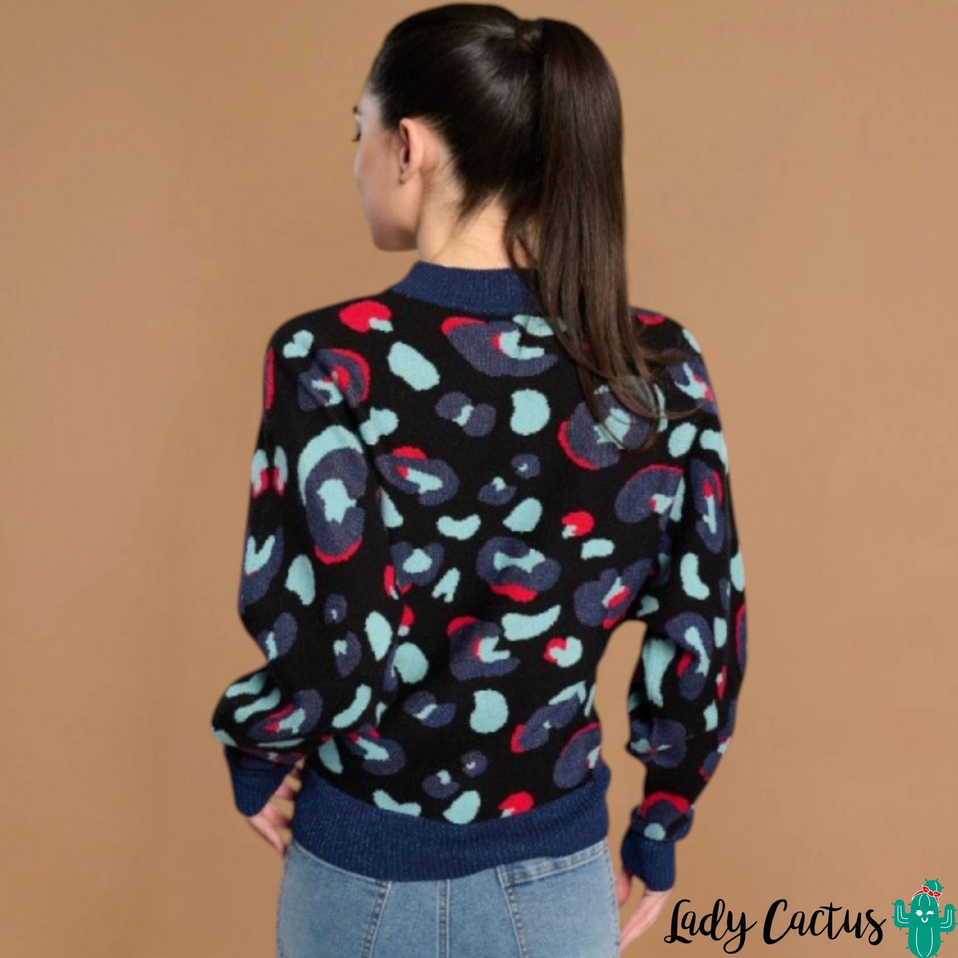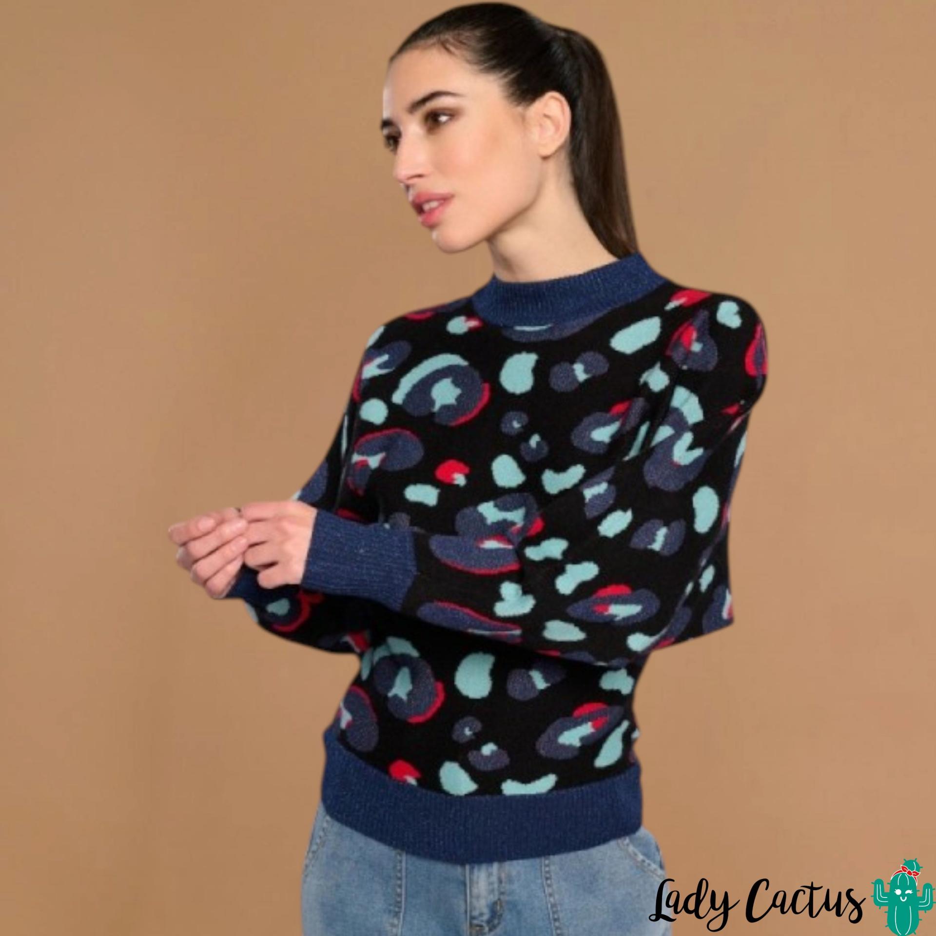Jersey Leo azul marino de Minueto: punto elástico con animal print, cuello redondo y rib en mangas, fluido y audaz para un estilo moderno y feroz.