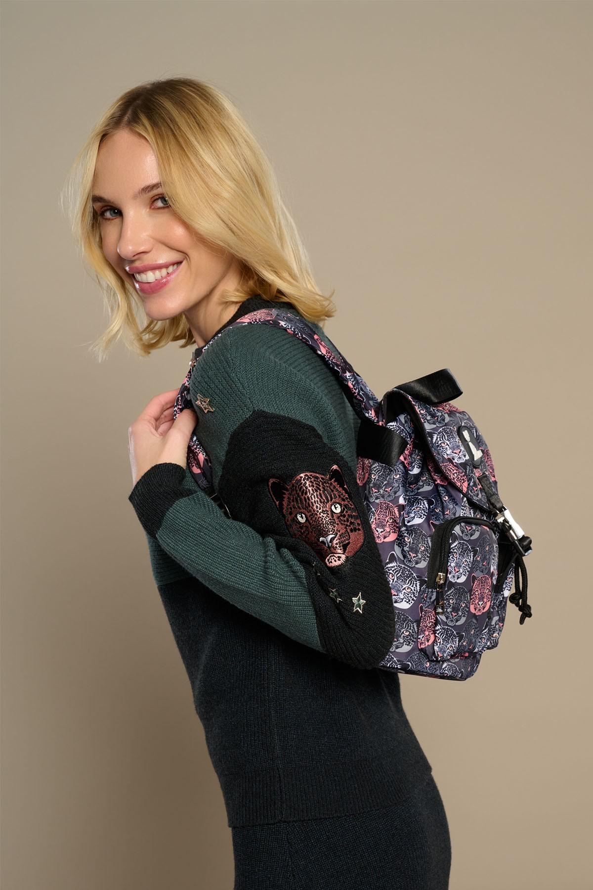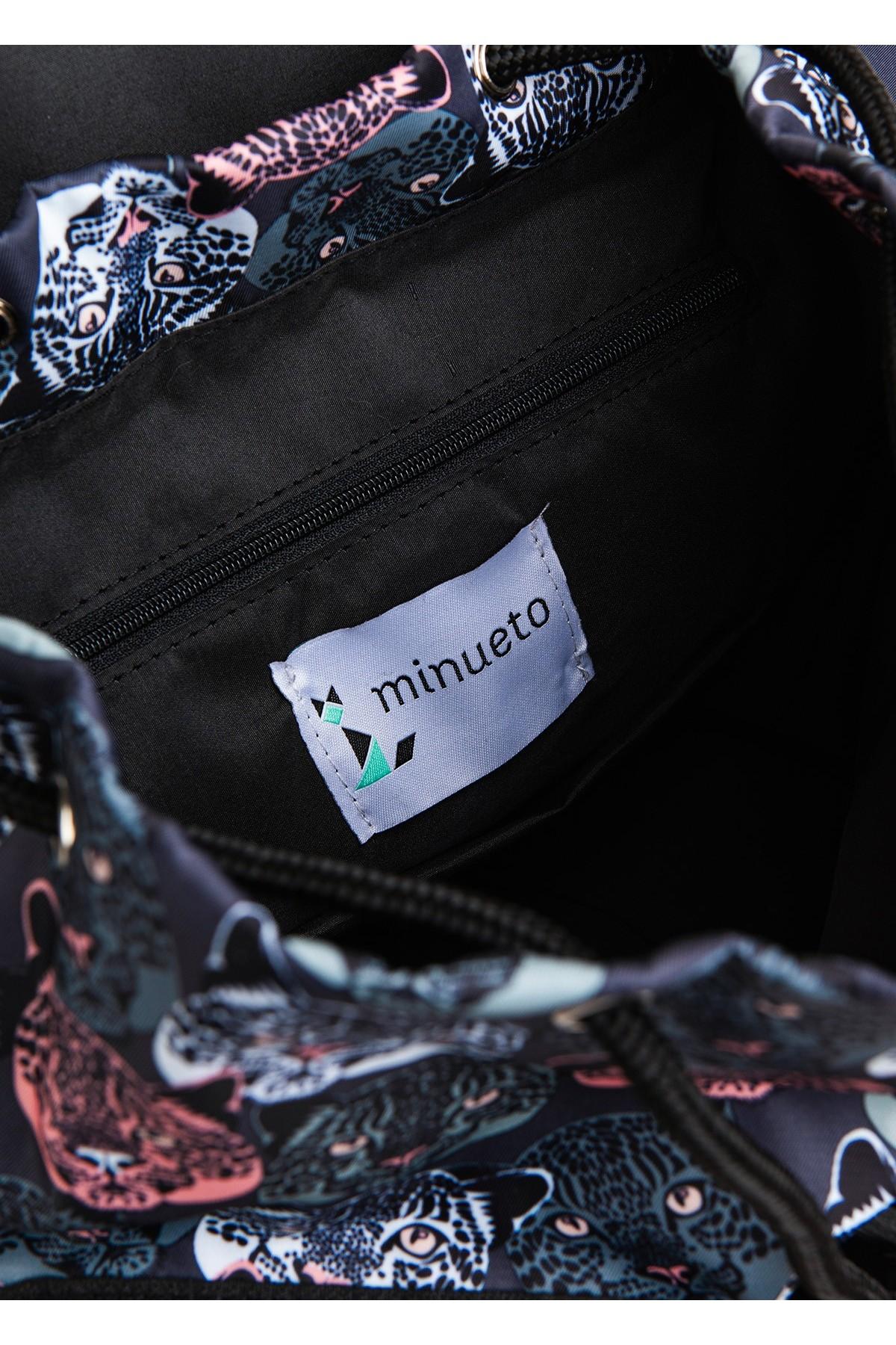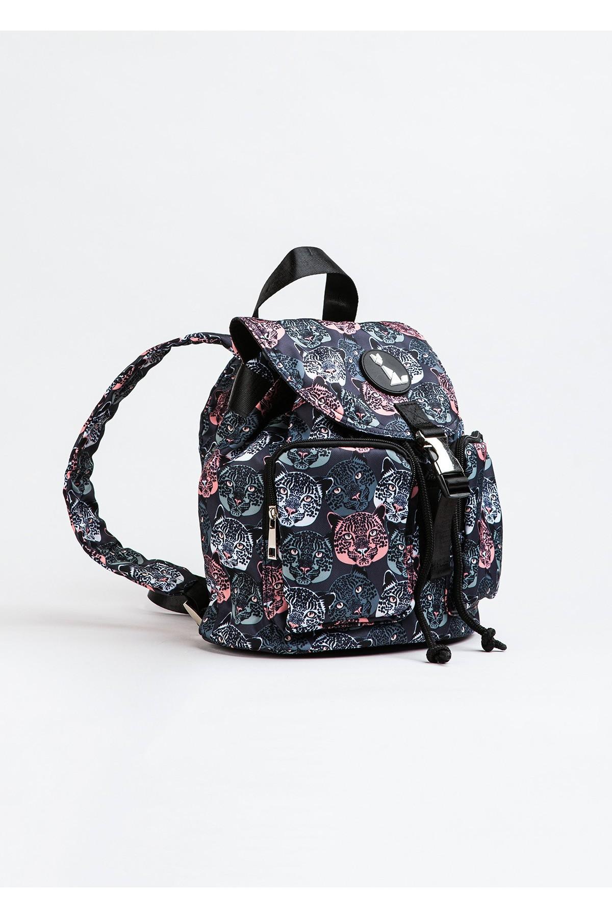 Mochila en estampado animal print. Exterior de nylon. Cierre ajustable con tapa y enganche. Estructura blanda. Dos bolsillos con cierre con cremallera. Asa de tejido. Logo Minueto. Medidas aproximadas: 30 x 30 x 15 cm.