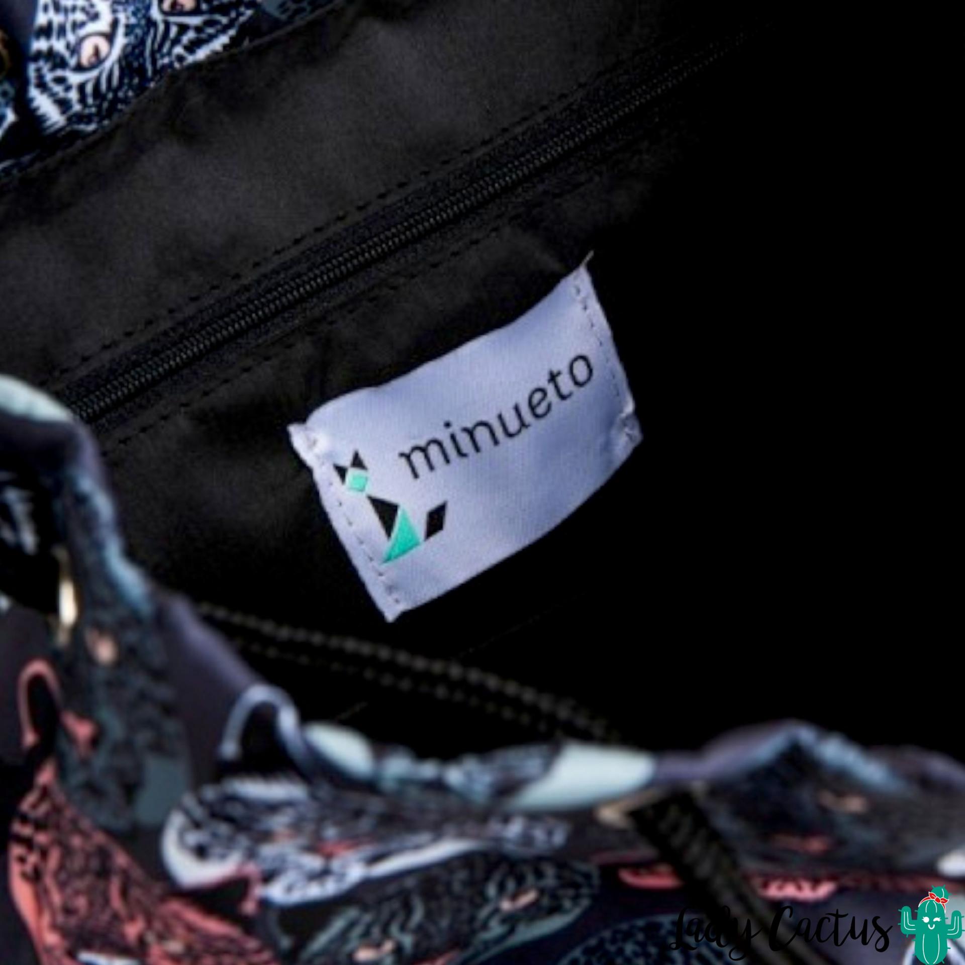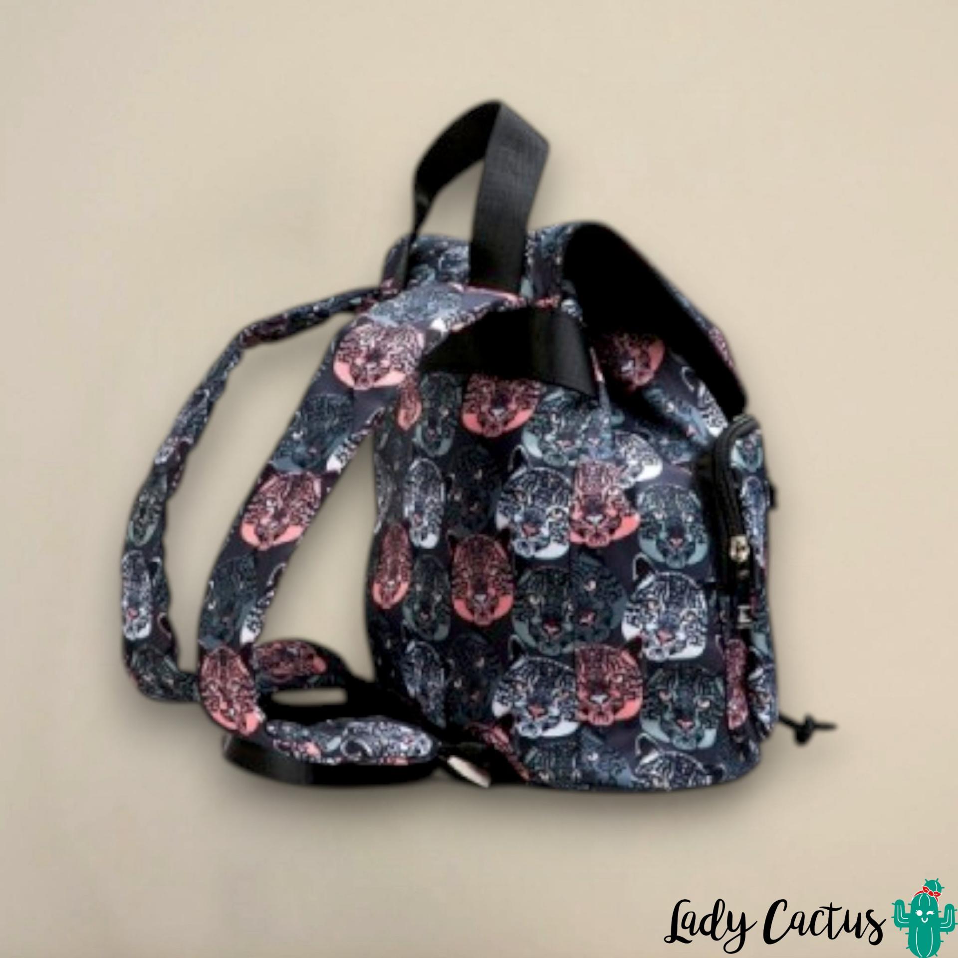 Mochila Gateta de Minueto: nailon animal print con cierre tapa, bolsillos cremallera y asa tejida, estructura blanda para un estilo aventurero y práctico.