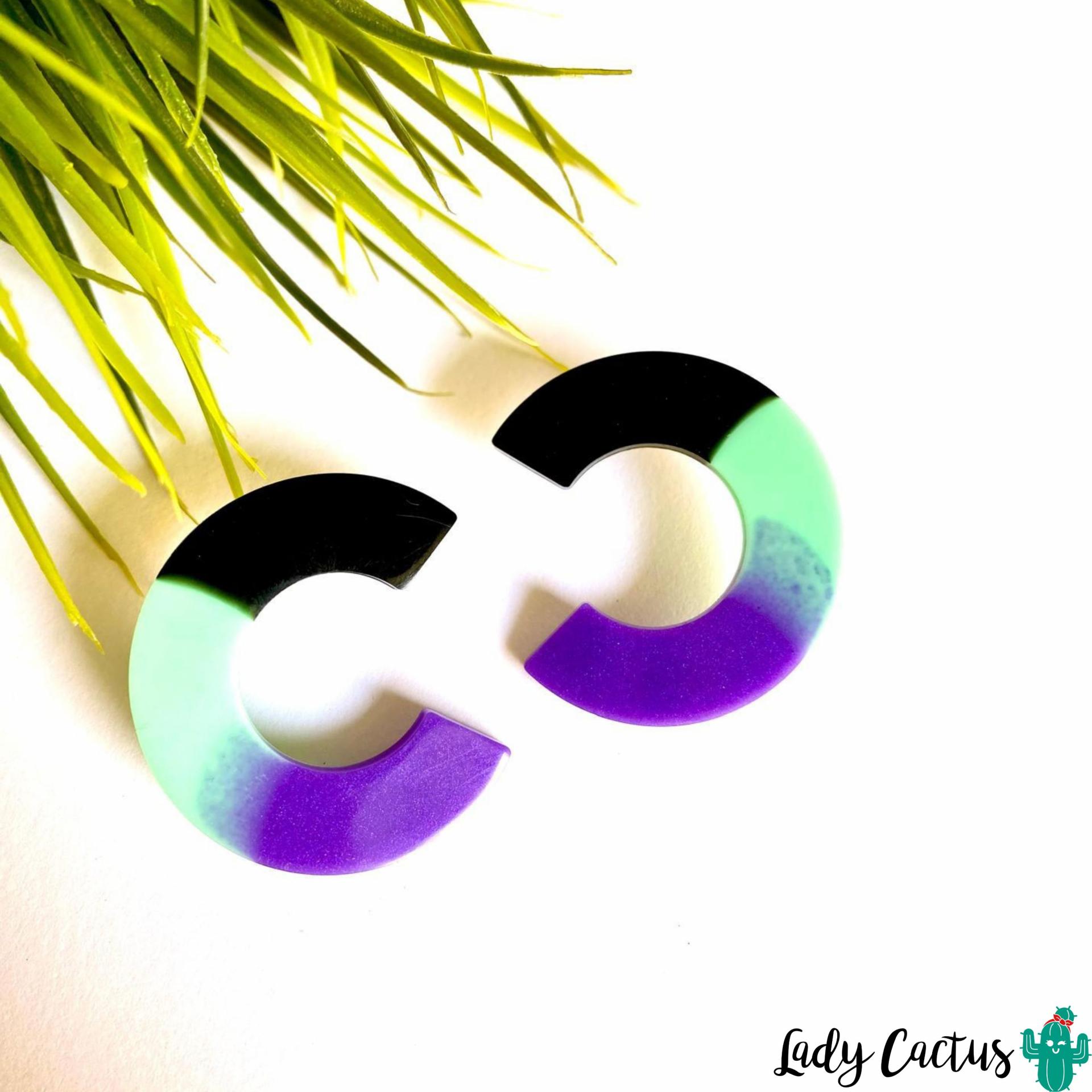 Pendientes semicírculo malva verde de Lady Cactus: resina epoxi handmade con tonos misteriosos, pegaditos ligeros en tuerca acero inoxidable, serenos para joyería sevillana urbana y poética.