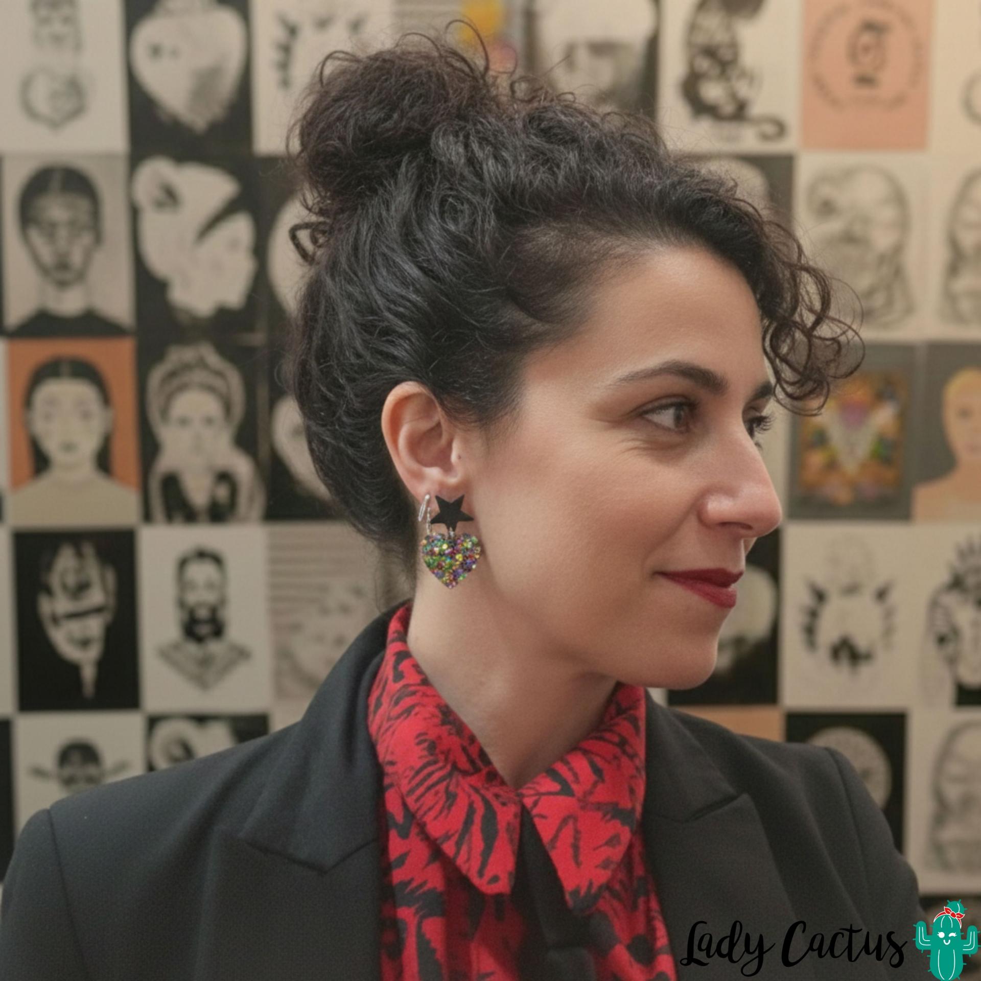 Pendientes corazón brillo multicolor de Lady Cactus: resina epoxi handmade mini con glitter juguetón, versátiles ligeros en tuerca acero con estrella negra, radiantes para joyería sevillana urbana y vital.