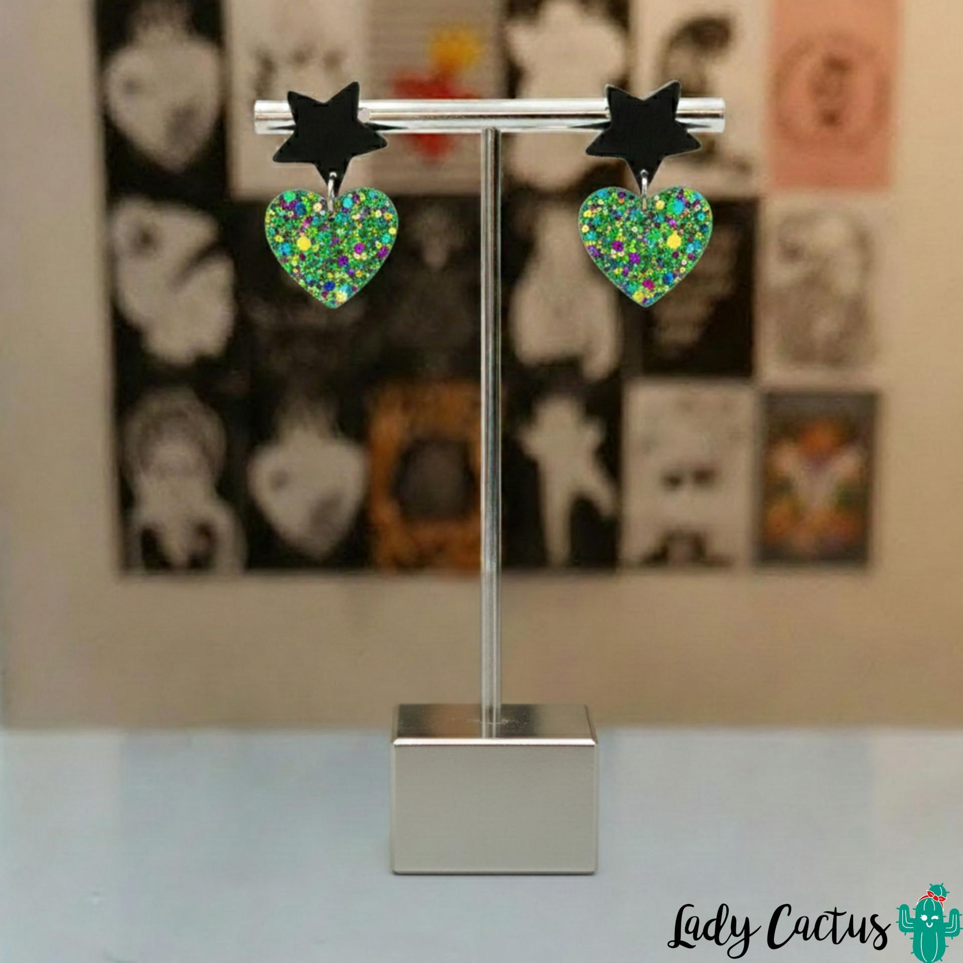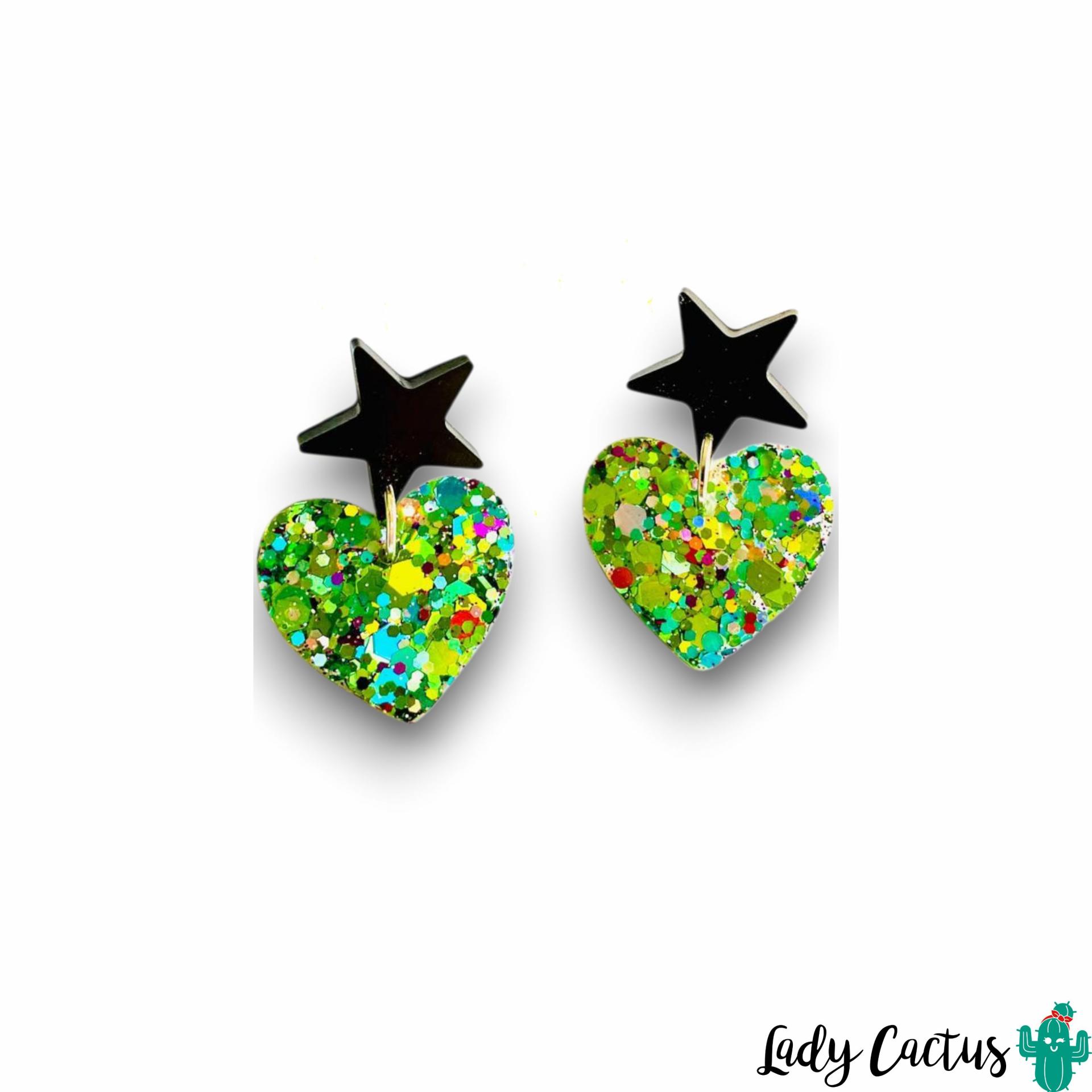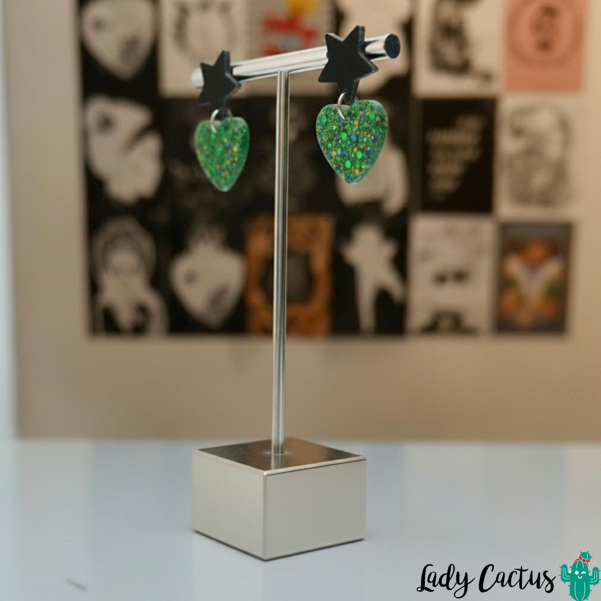 Pendientes corazón brillo verde de Lady Cactus: resina epoxi handmade mini con glitter juguetón, versátiles ligeros en tuerca acero con estrella negra, radiantes para joyería sevillana urbana y vital.