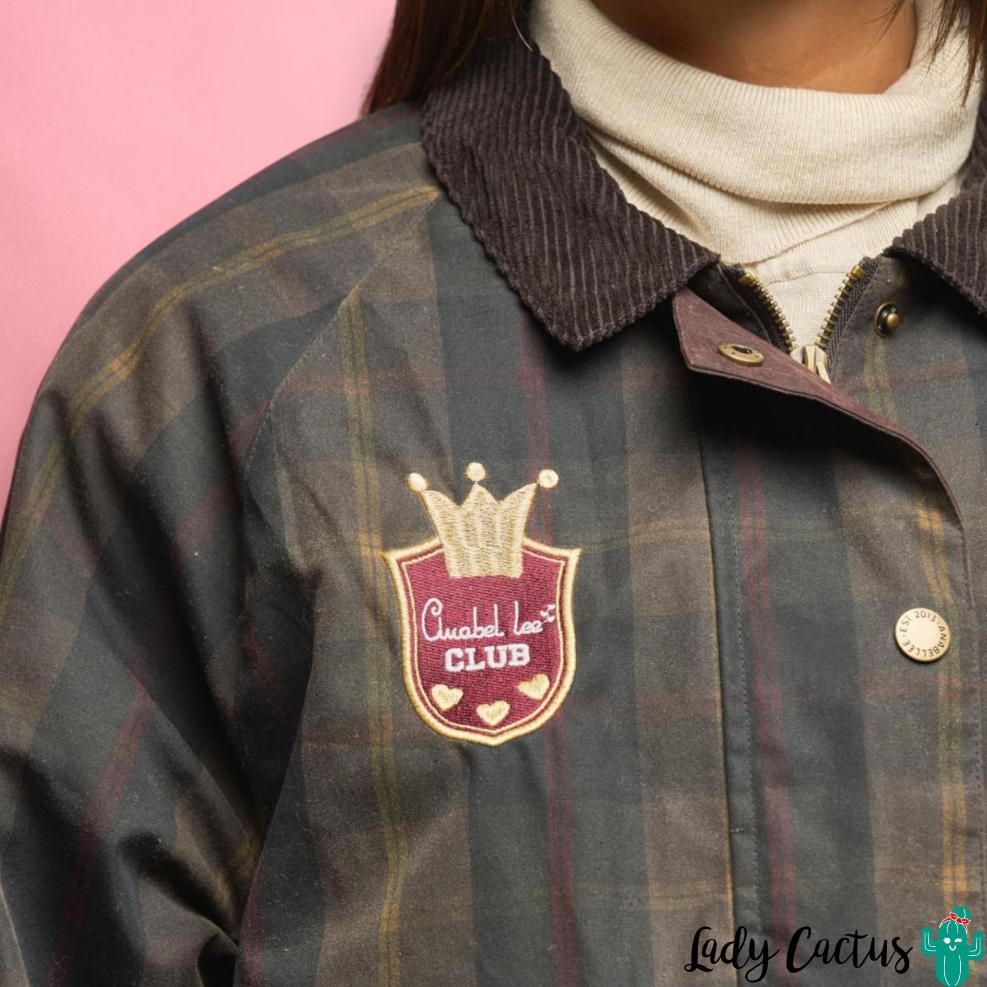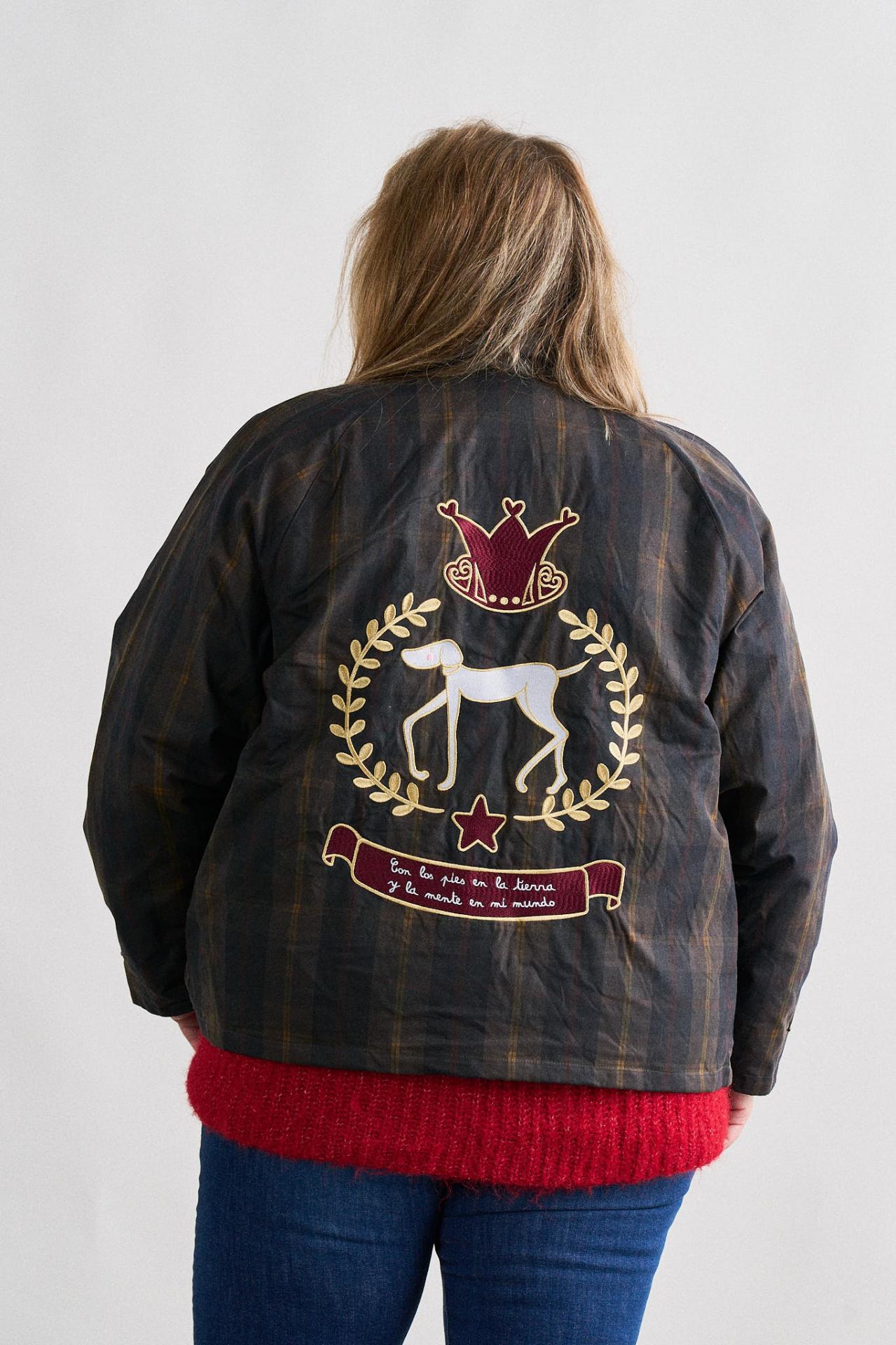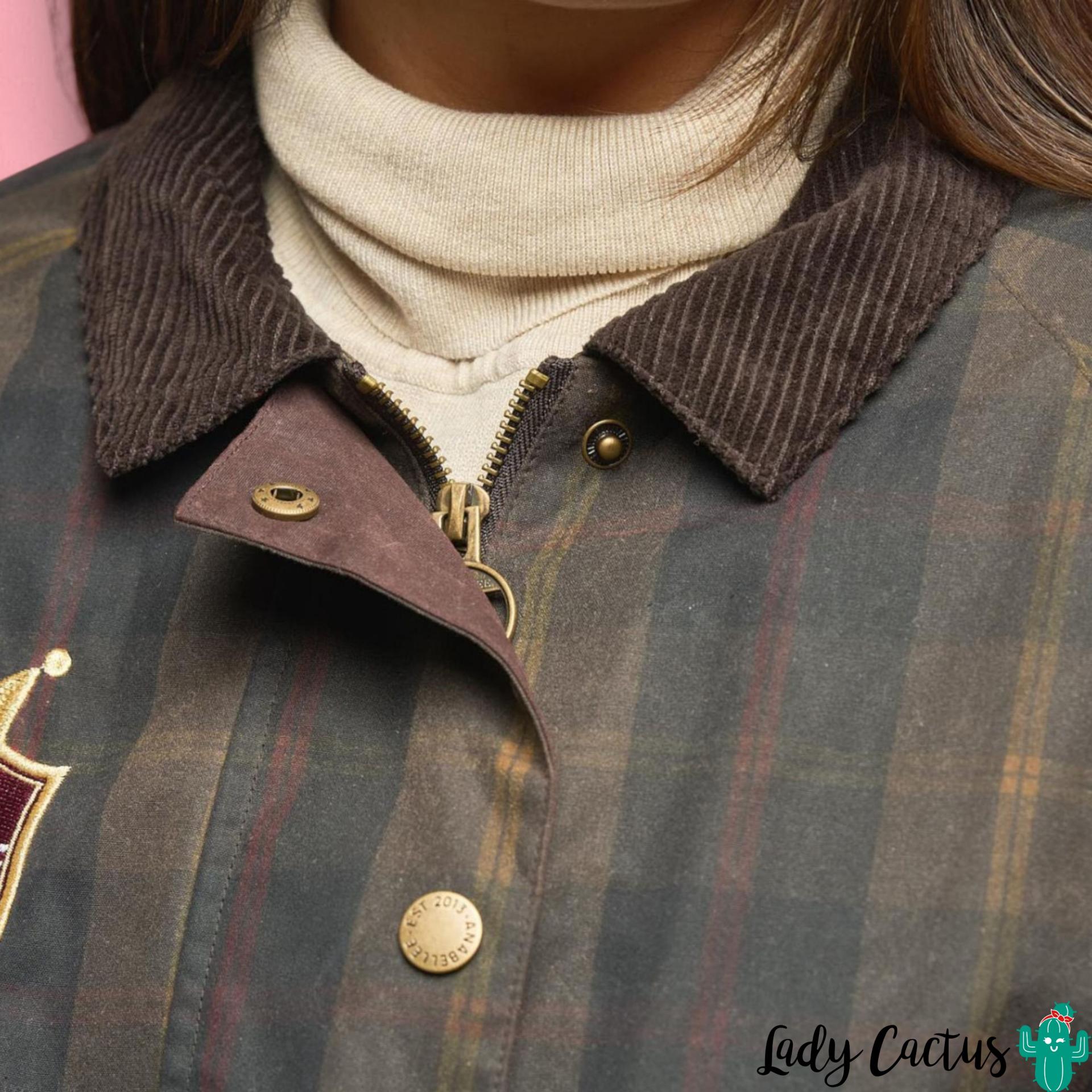 Chaqueta Glasgow de Anabel Lee: tartán encerado algodón repelente al agua con borreguito desmontable, oversize poética bordada para un estilo español emocional y versátil.