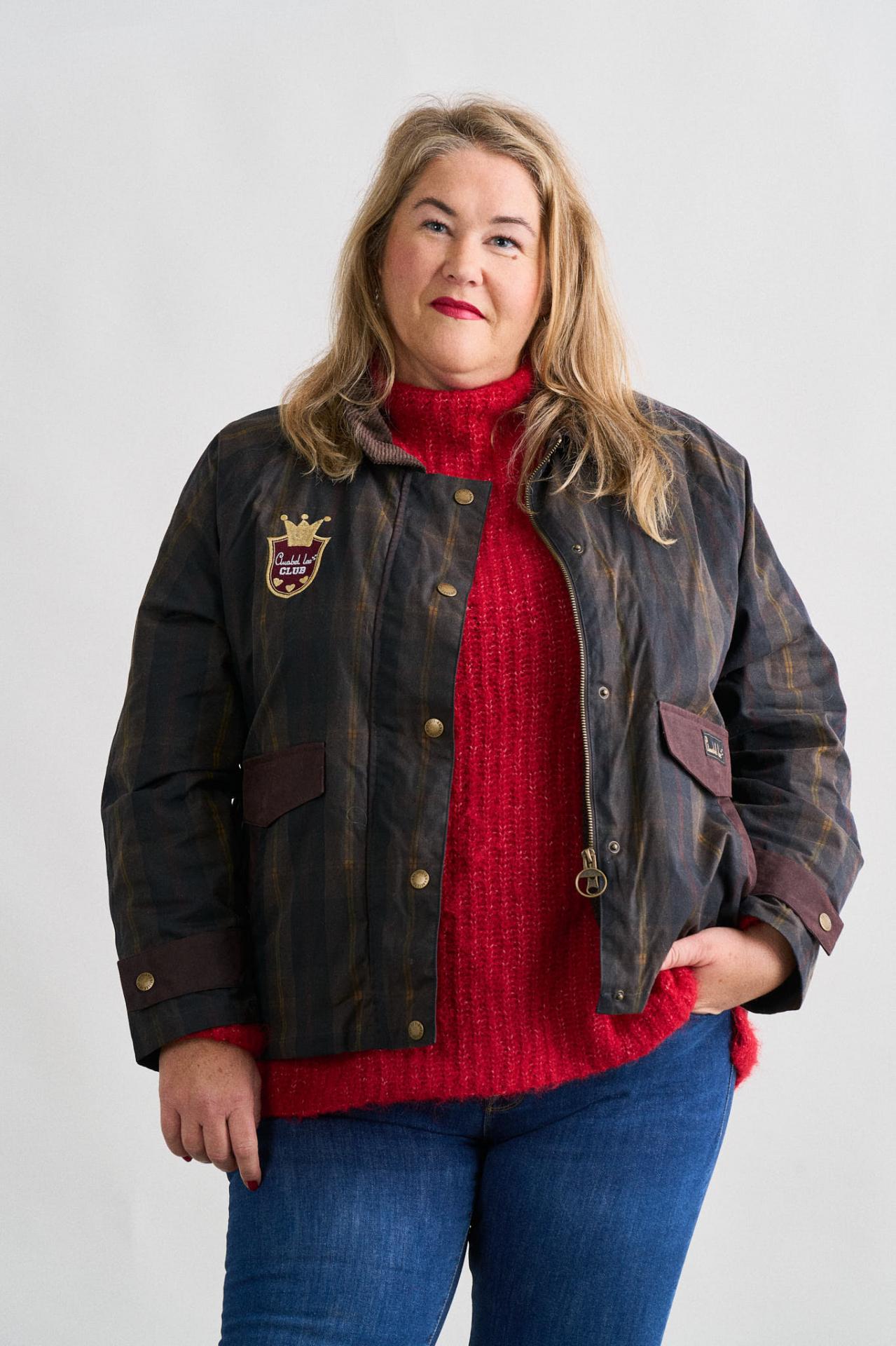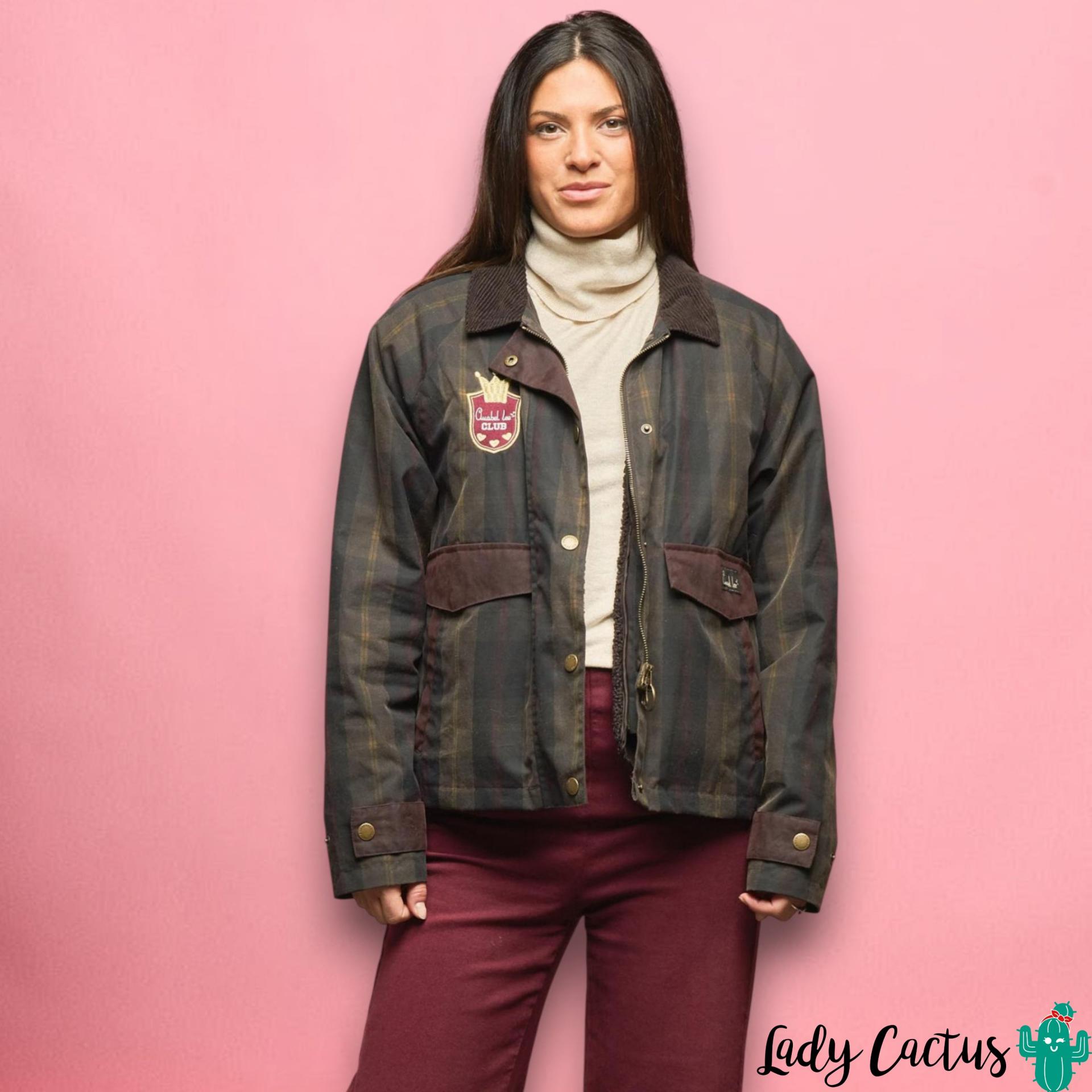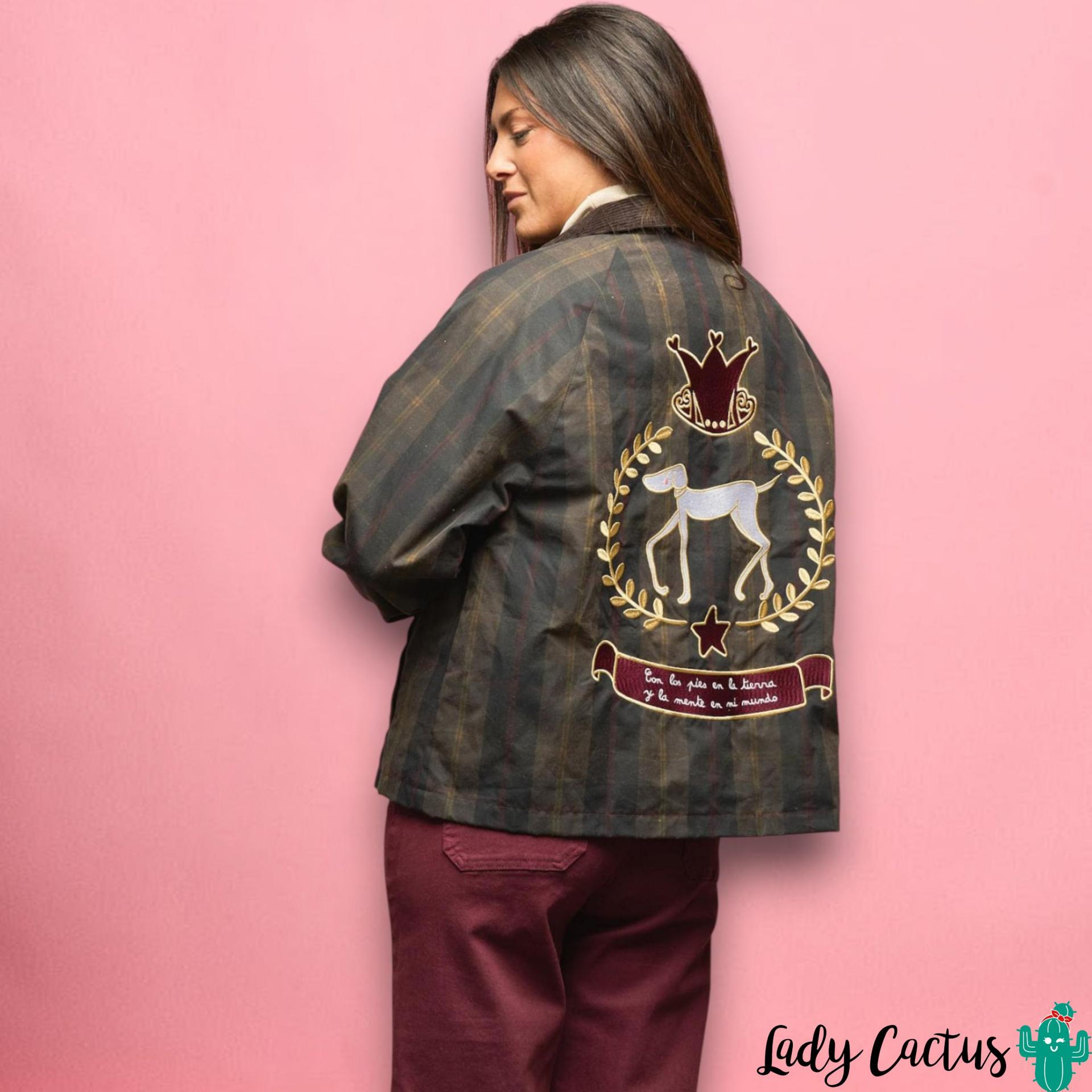 Chaqueta Glasgow de Anabel Lee: tartán encerado algodón repelente al agua con borreguito desmontable, oversize poética bordada para un estilo español emocional y versátil.