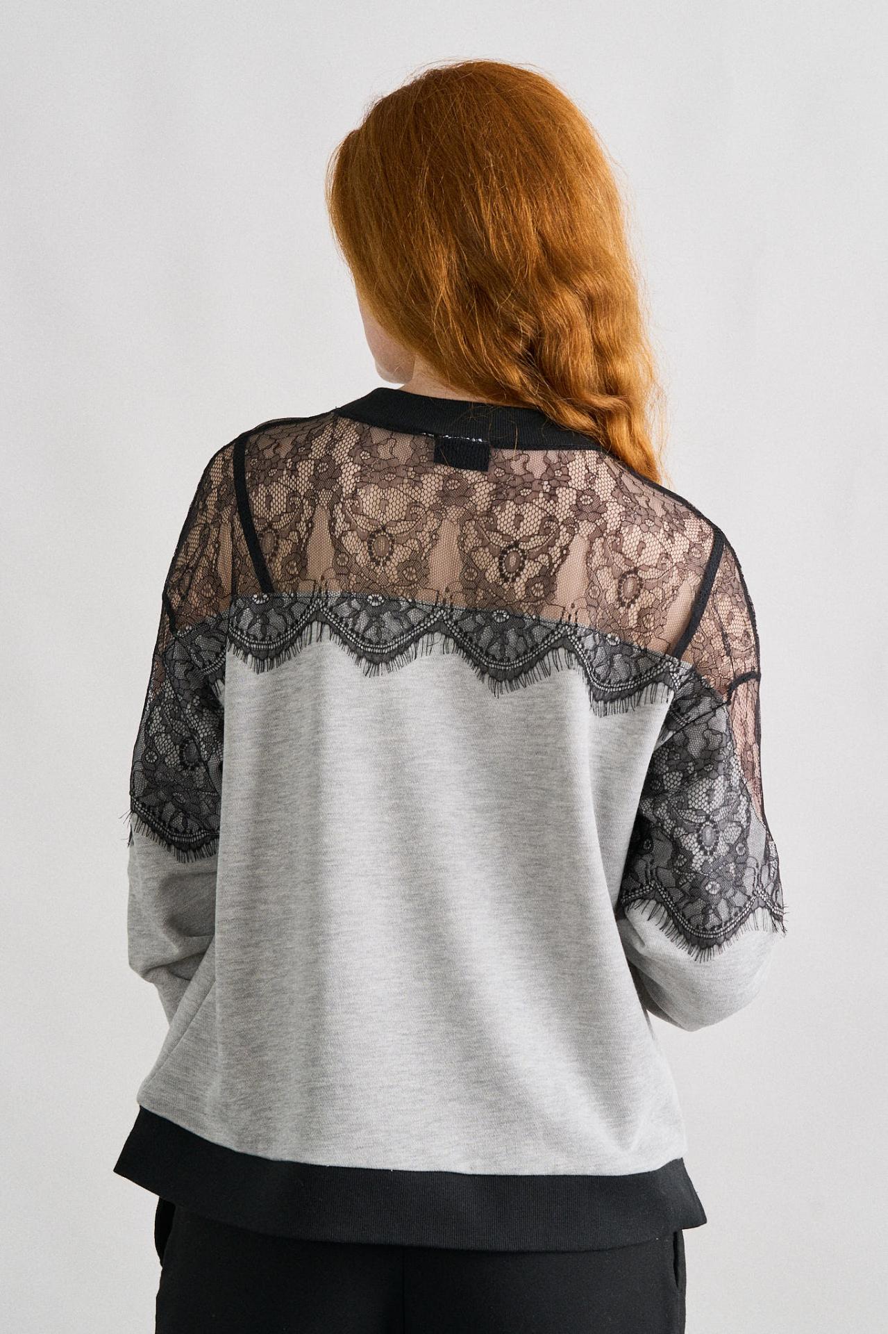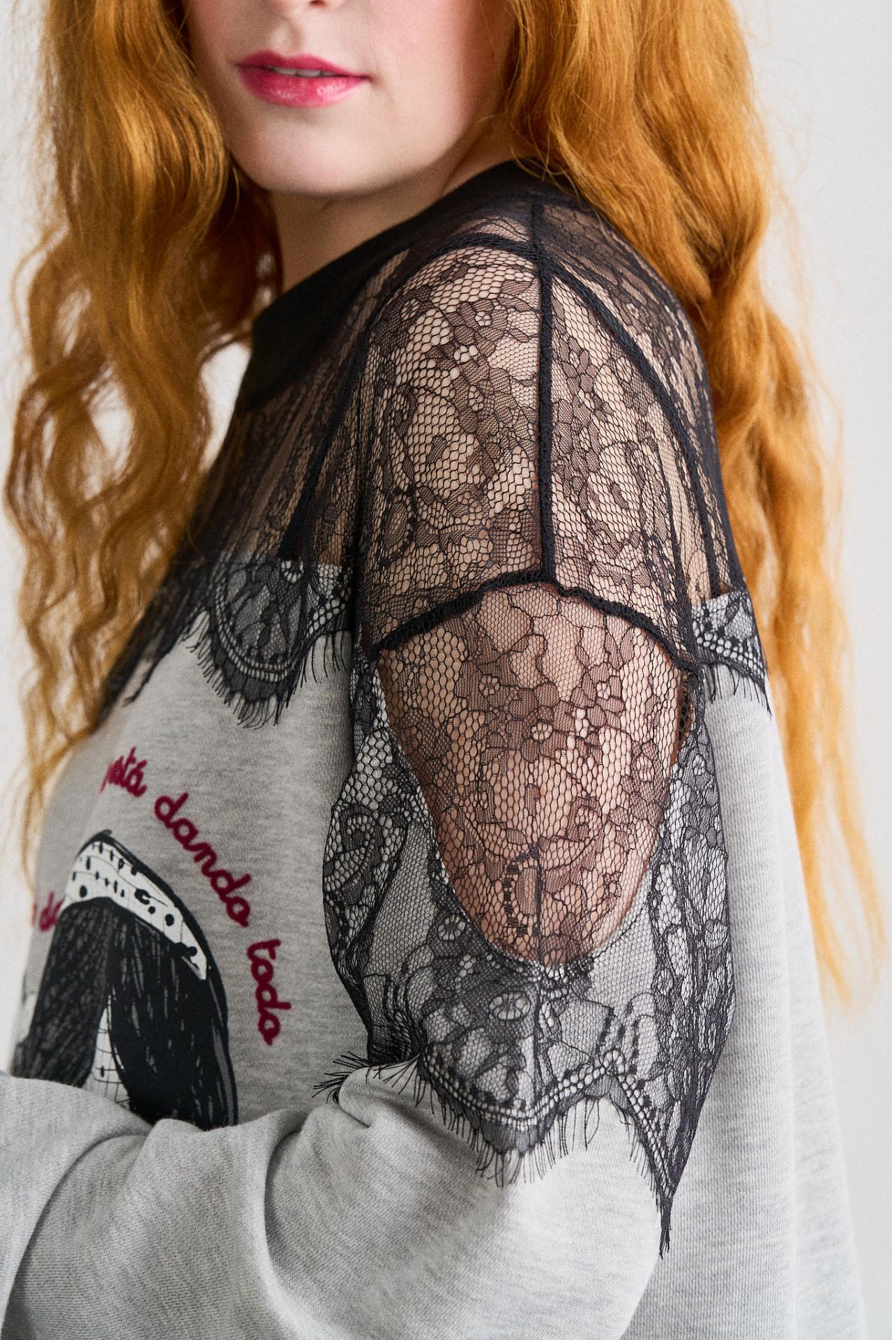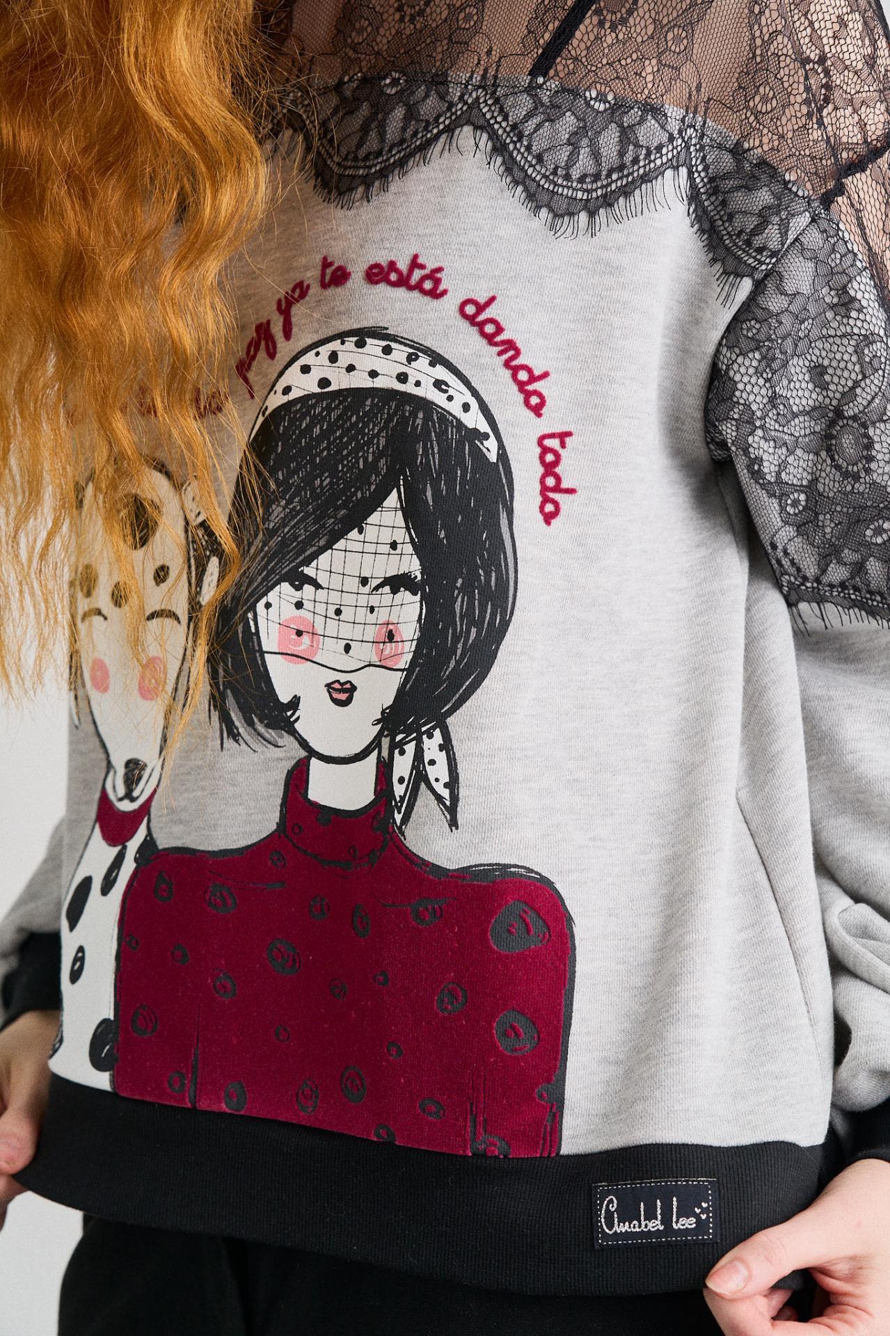 - La sudadera está confeccionada en una suave felpa americana de rizo, de color gros claro y con un precioso encaje negro; la composición de la prenda es de 69% algodón y 31% poliéster.