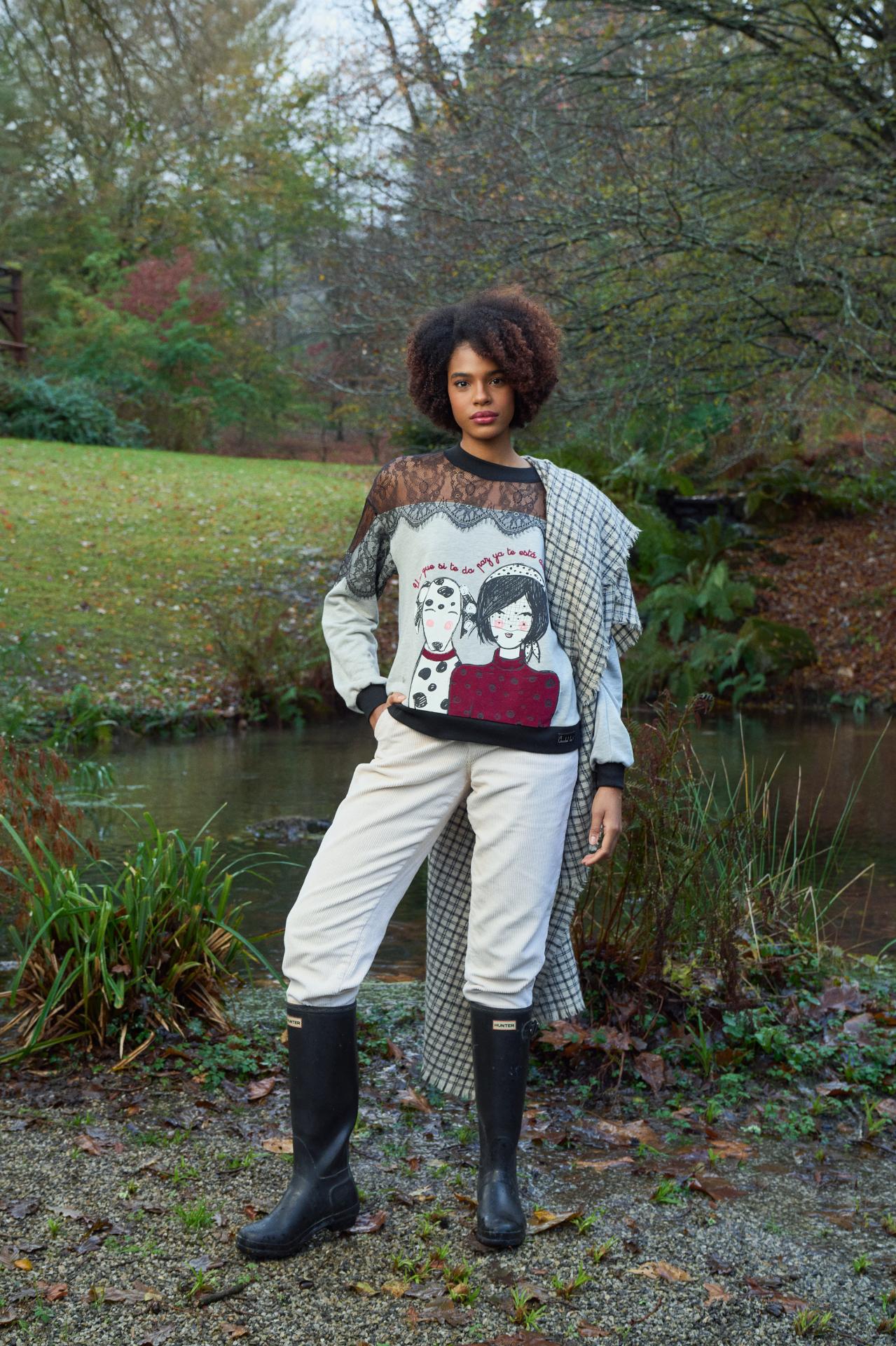 El precioso maxiprint delantero está serigrafiado en blanco y negro, combinando de una manera muy acertada con el tono burdeos que encontramos en los detalles en flocko, como son: el jersey de la chica, el collar del dálmata y la frase.