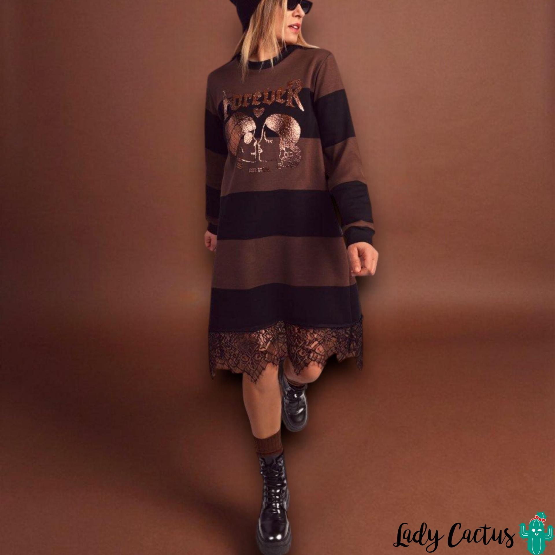 Vestido Forever Blonda de Aire Retro: rayas algodón felpa con bajo blonda y serigrafía cobre relieve, cálido emocional para un estilo urbano español rebelde y versátil.