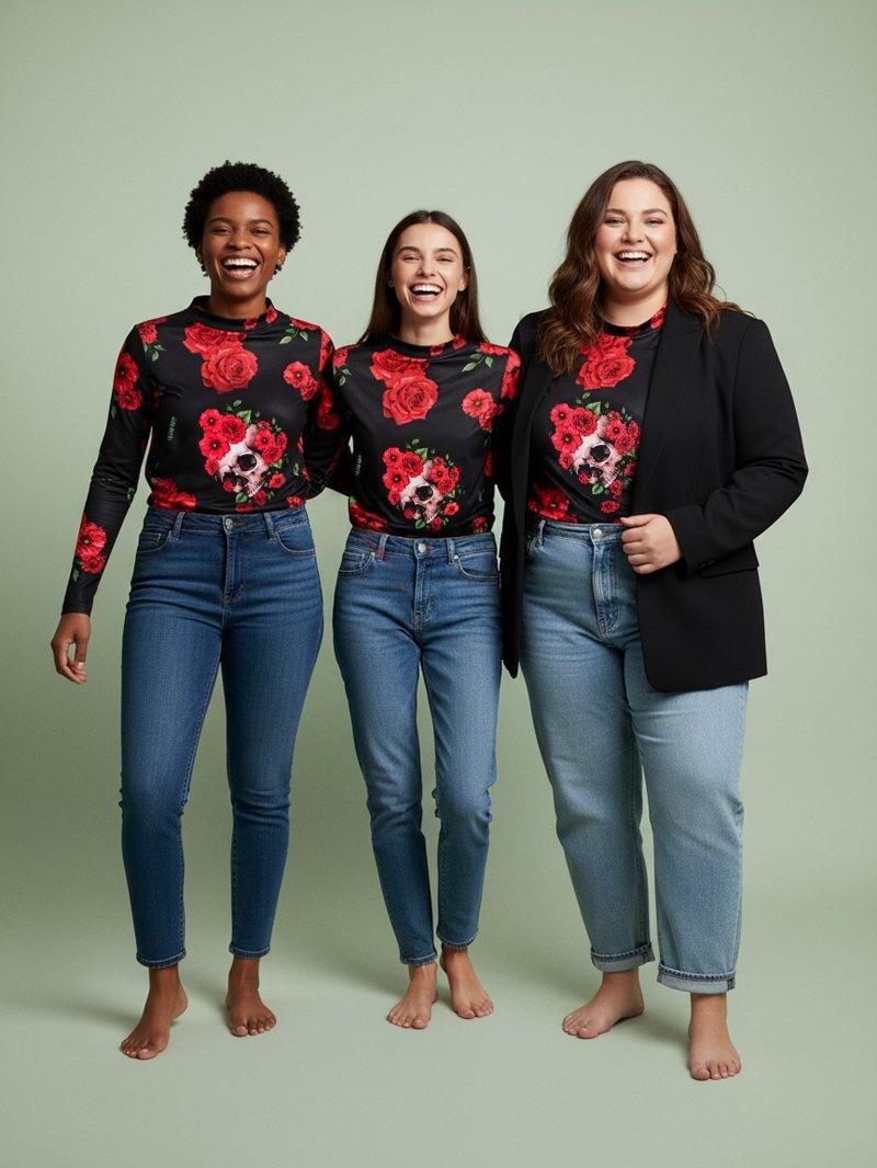 Camiseta Rosas & Calaveras, es un estampado total print de punto, un mix de imágenes y frases que hacen la prenda aún más especial, la segunda piel que encaja es todos tus outfits! No pasarás desapercibida, lo prometo!